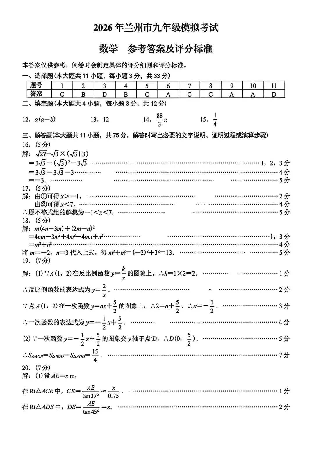 >2026兰州九年级数学一诊试卷(含解析)