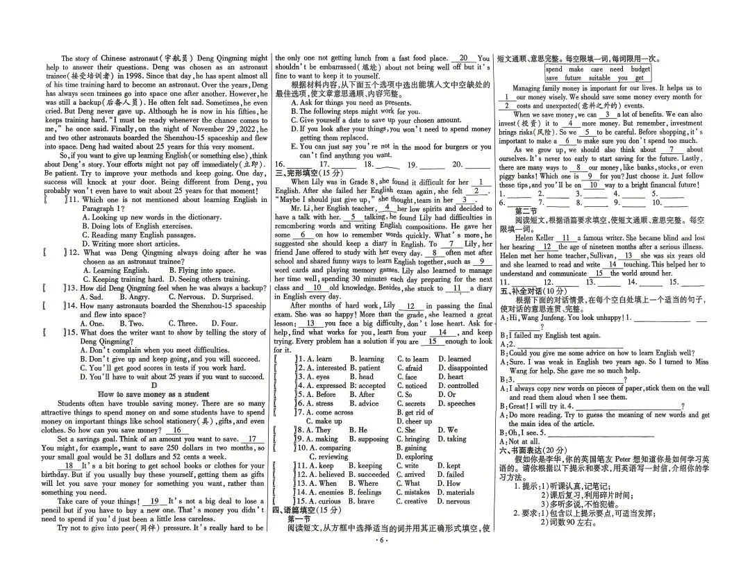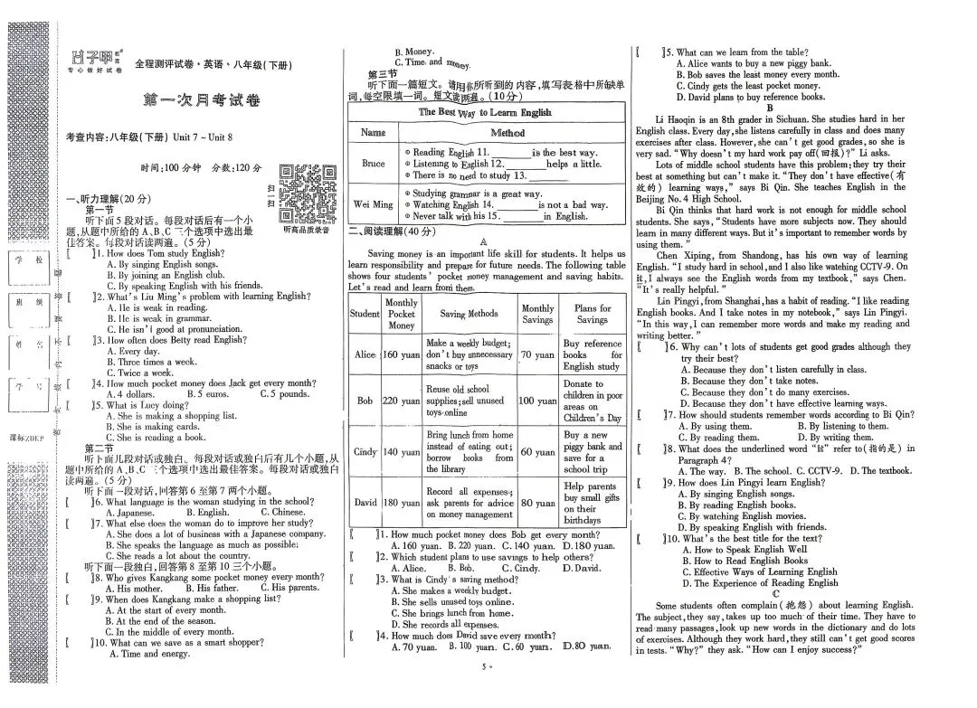 听力、阅读、完形等题型均围绕学生生活(零花钱管理、英语学习方法、成长故事)展开,贴合课标 “在真实语境中运用语言” 的要求,避免机械刷题。