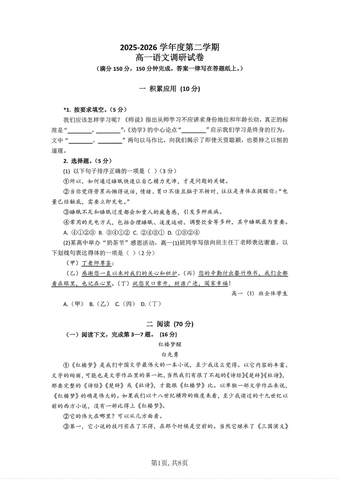 >【SH高中四校八大试卷群更新】上海市上海交通大学附属中学2025-2026学年高一下学期第一次调研语文
