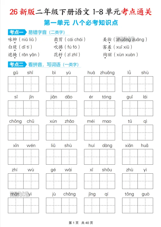 今天给大家准备好了!~【海豚试卷】二年级(下)语文1-8单元考点通关丨可下载打印