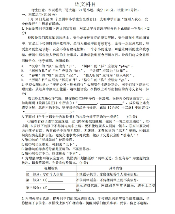 2026试卷| 五年级下册语文《第一次月考试卷》打印练习!