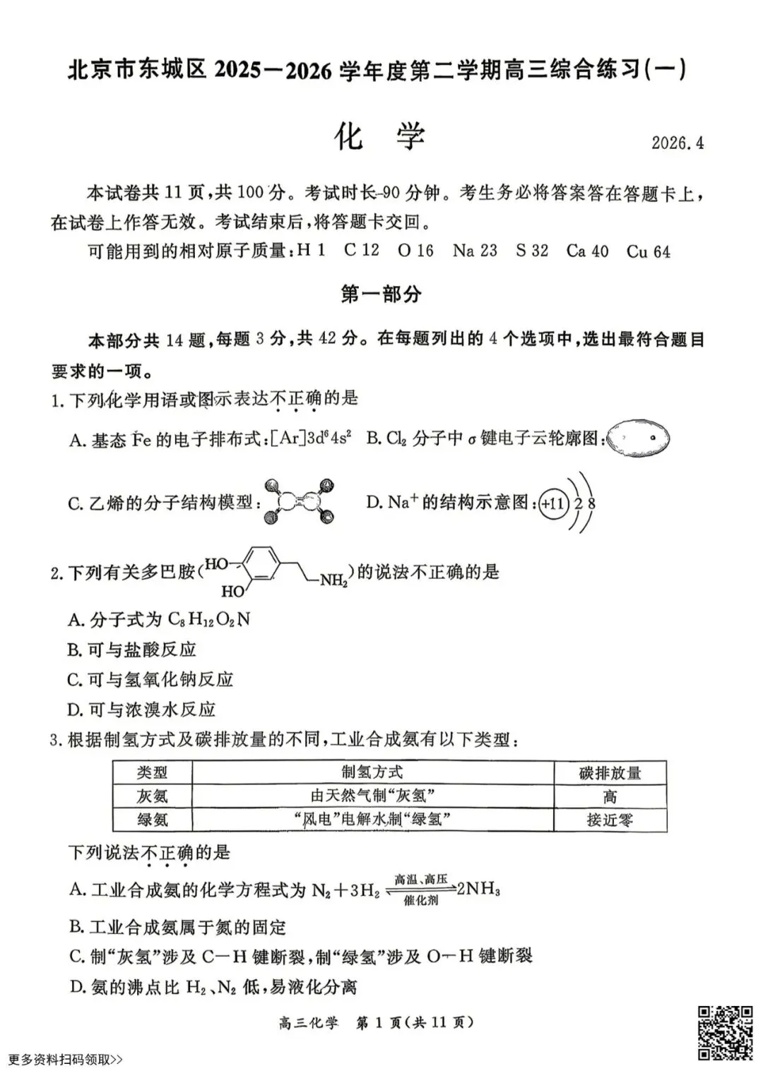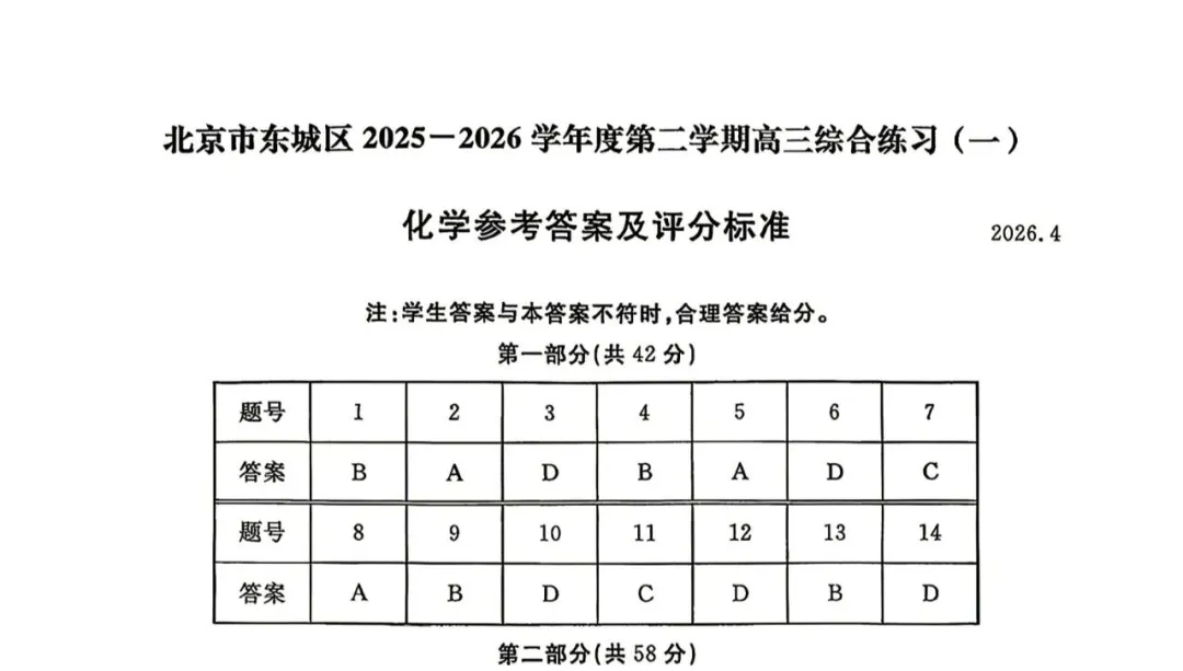 今天给大家分享的是2026北京东城高三一模化学试卷(含答案),其他区域或学校的学生都可以练一练。近期会持续分享,欢迎大家多多关注,也可以把我们分享给更多人哦。