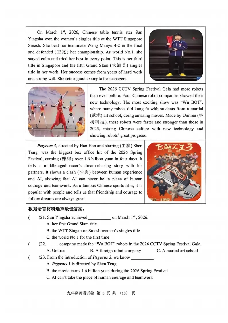 >2026平房区九下英语一模试卷及答案