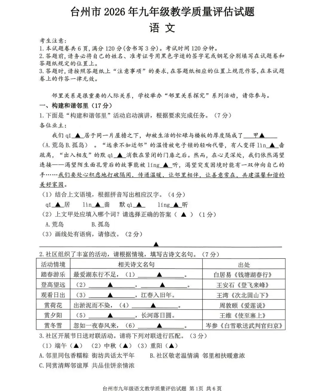 【2026浙江期末】嘉兴市期末数学试卷(七八九年级)