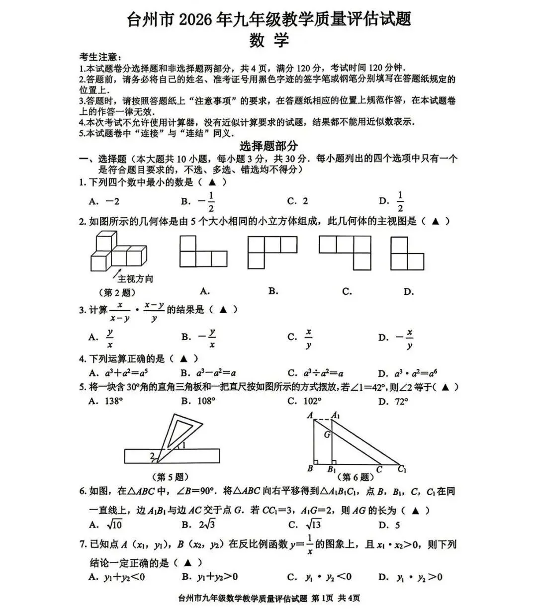当前位置:首页>考研真题>【2026浙江一模】台州市中考一模数学试卷(2026.4)