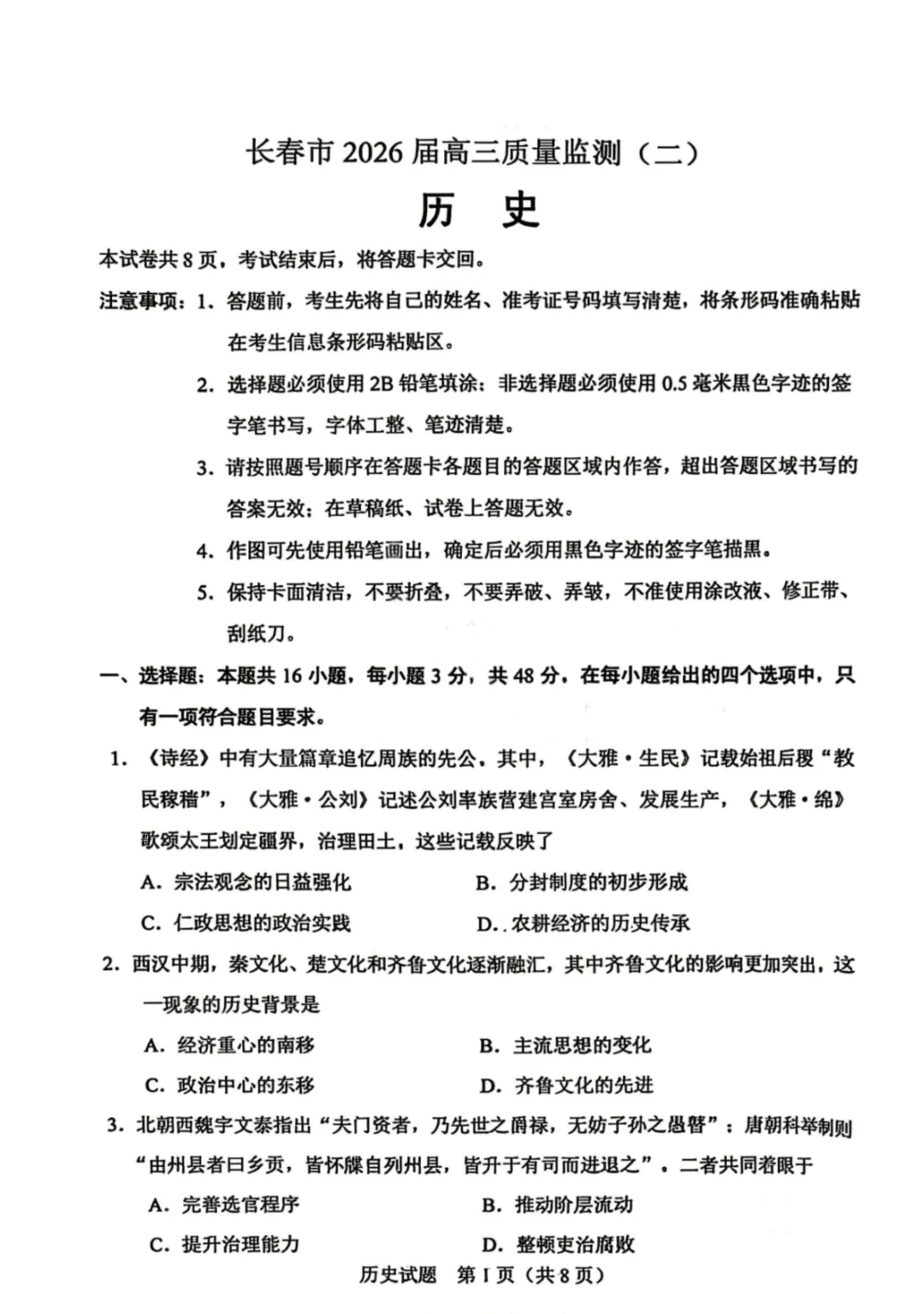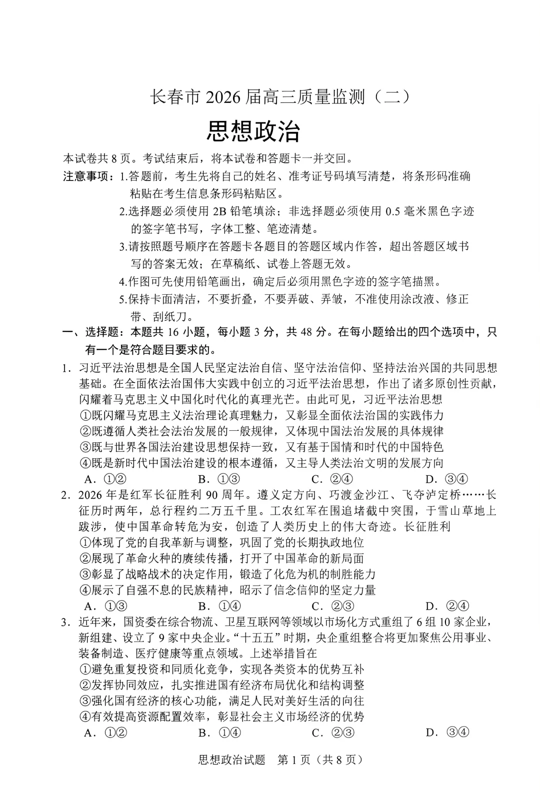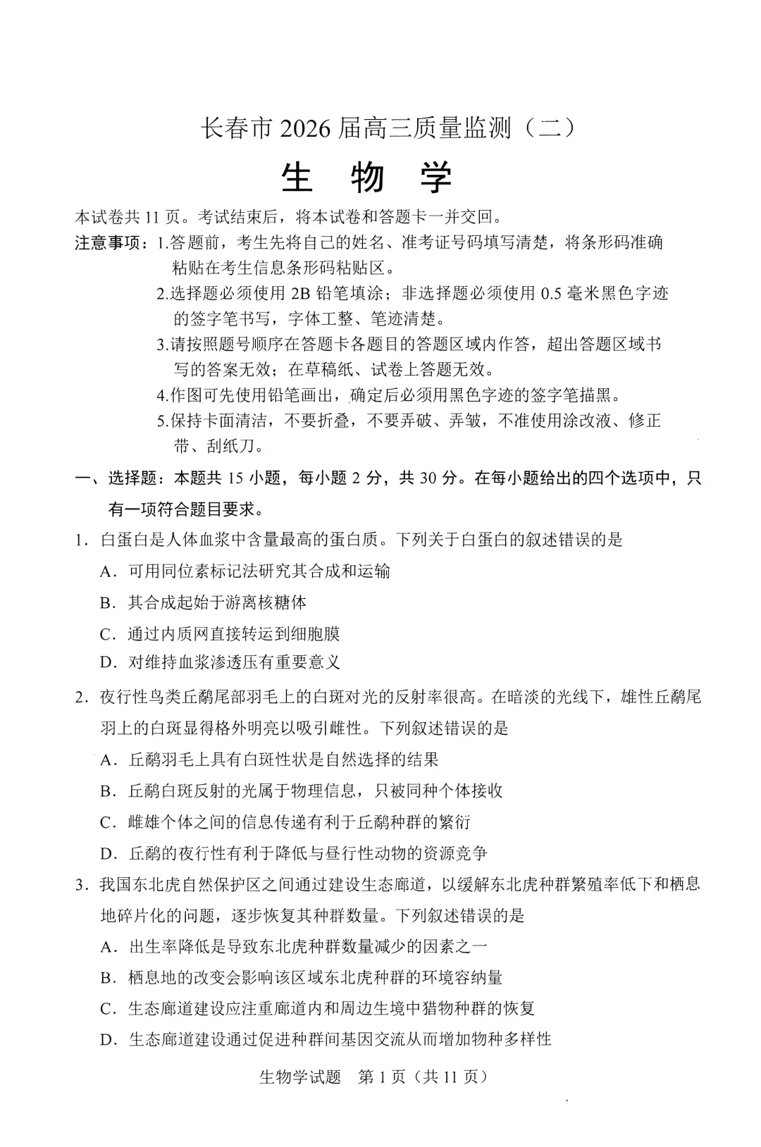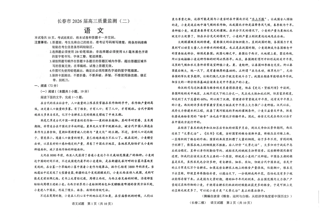 >2026届长春高三二模全科试卷及答案