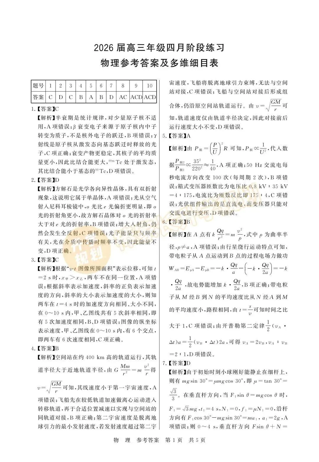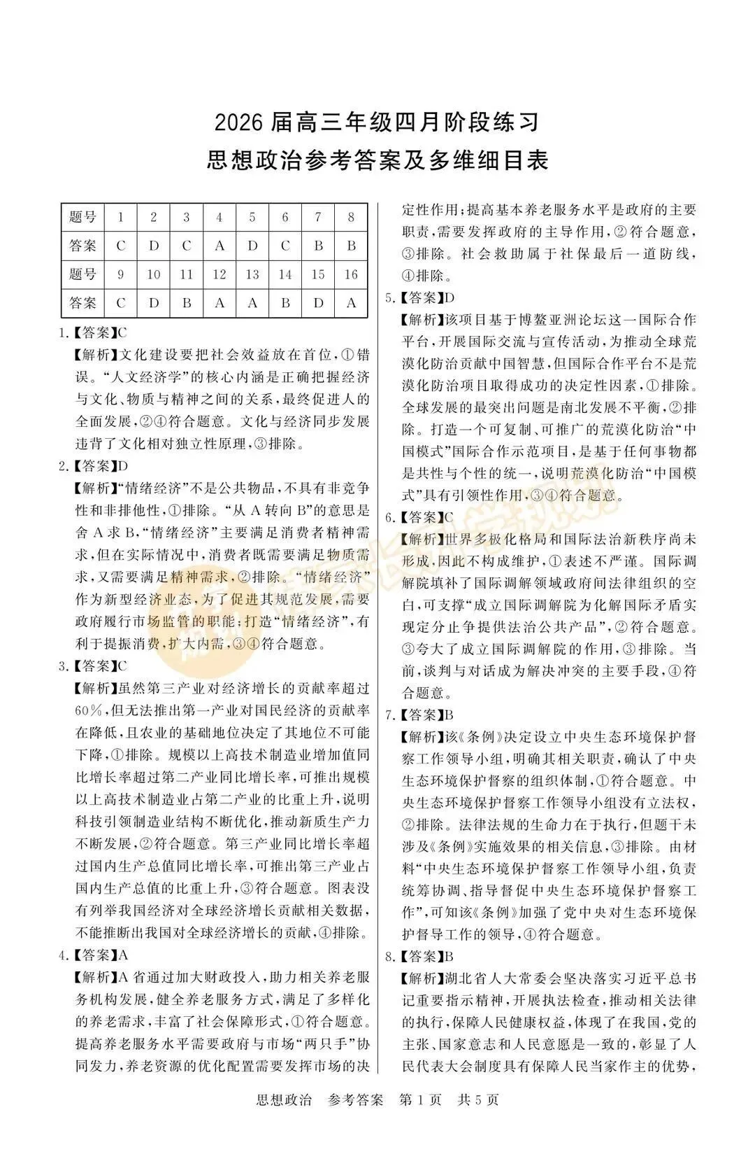 湖北版试卷答案汇总