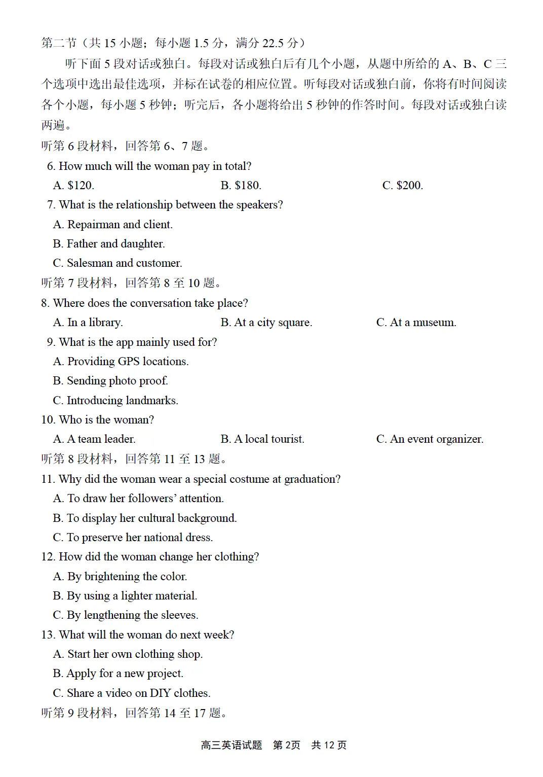 第一部分听力(共两节,满分30分)