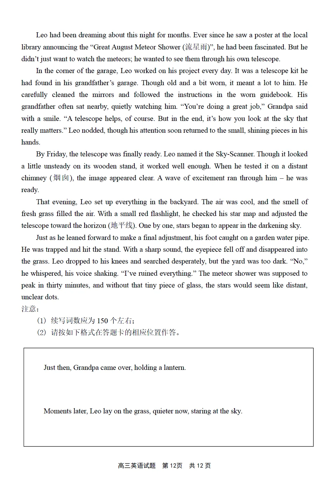 Just then, Grandpa came over, holding a lantern.“Grandpa, I can’t find the eyepiece!” Leo said anxiously. Together they searched the grass, the soft light moving slowly back and forth. After a while, however, Grandpa stopped and gently reminded Leo that he had already done well and should not miss the sky because of one small piece. Leo paused, his hands still in the grass. For a moment, he hesitated, then slowly straightened up and followed his grandfather’s gaze into the dark sky.