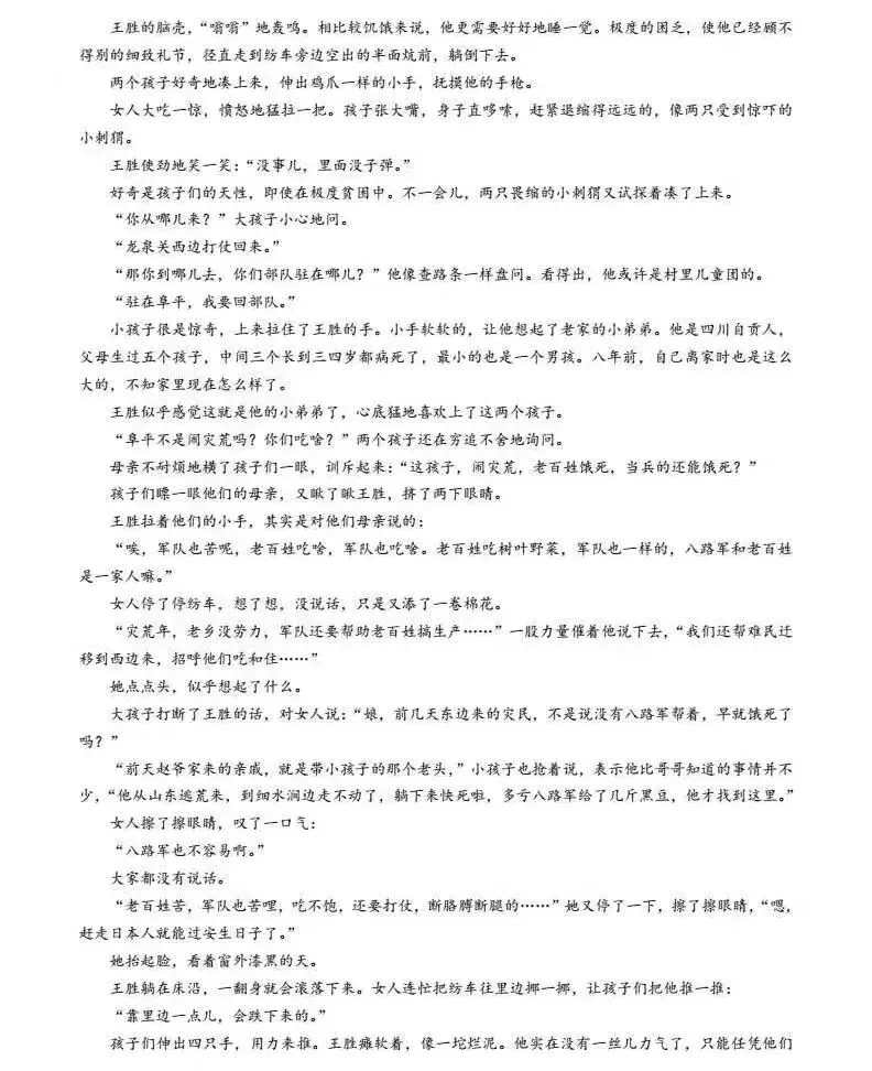 大孩打断了王胜的话,对女人说:“娘,前几天东边来的灾民,不是说没有八路军帮着,早就饿死了吗?”