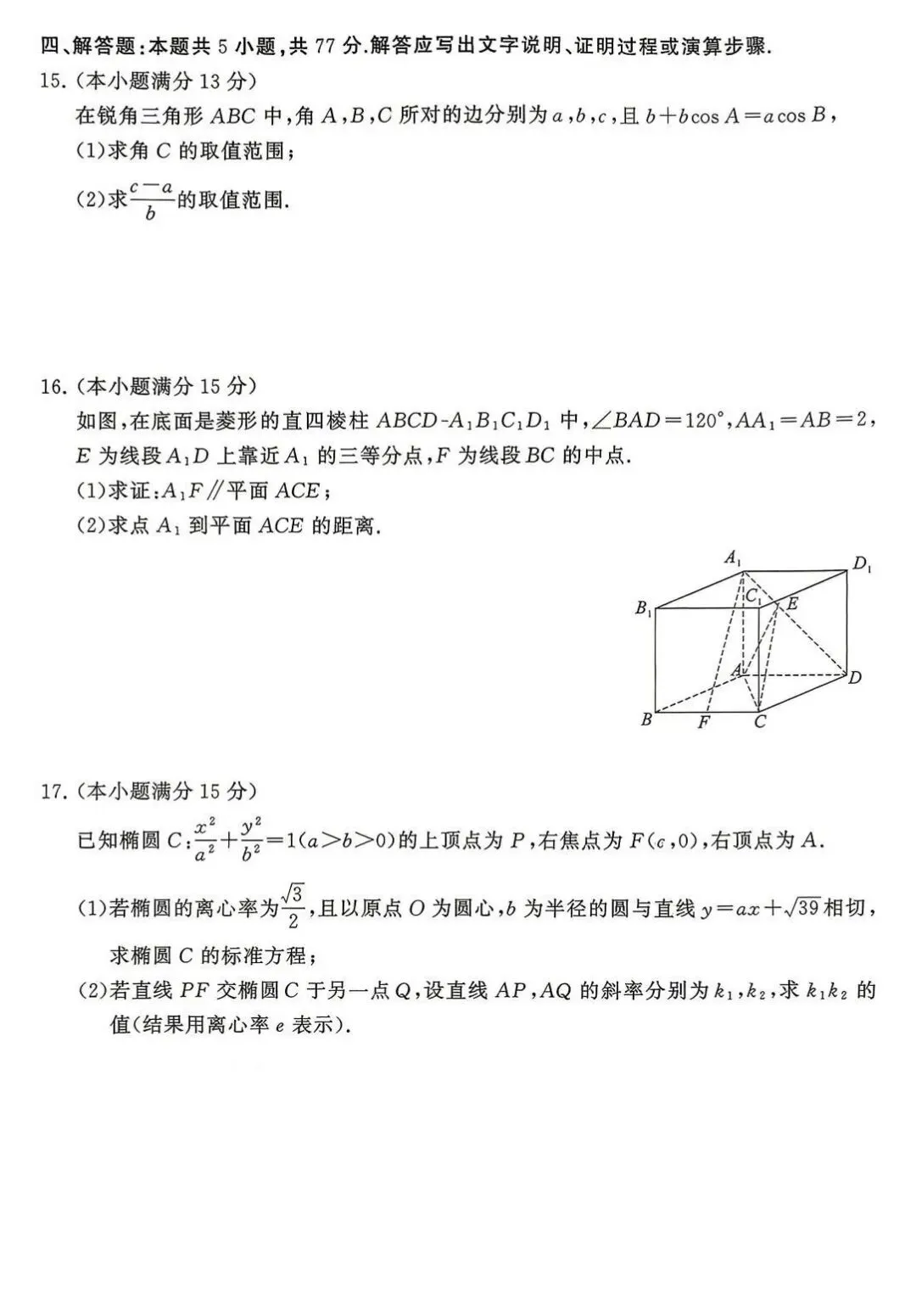 四、解答题(本题共5小题,分布为13+15+15+17+17,共77分.解答应写出文字说明、证明过程或演算步骤)