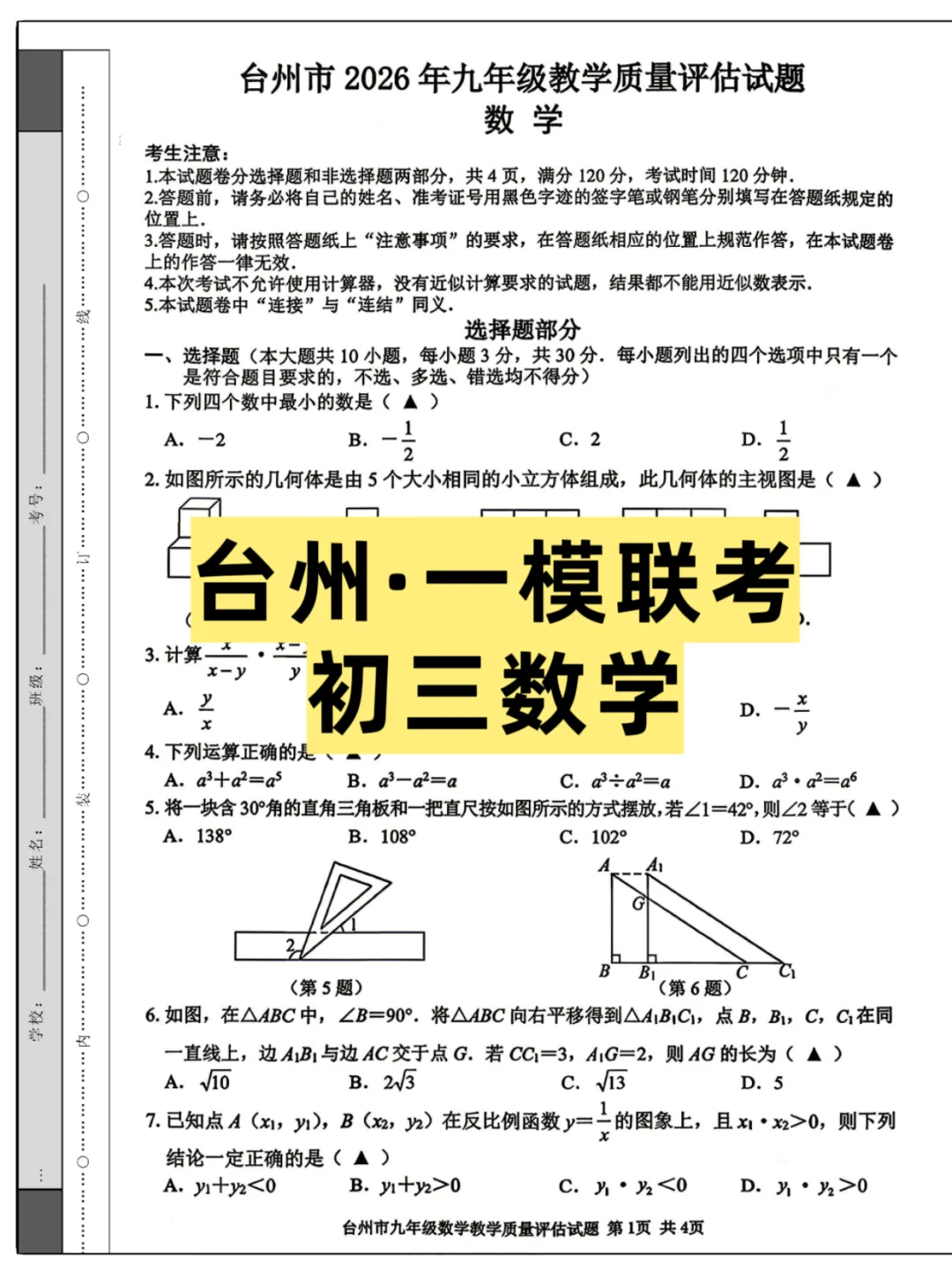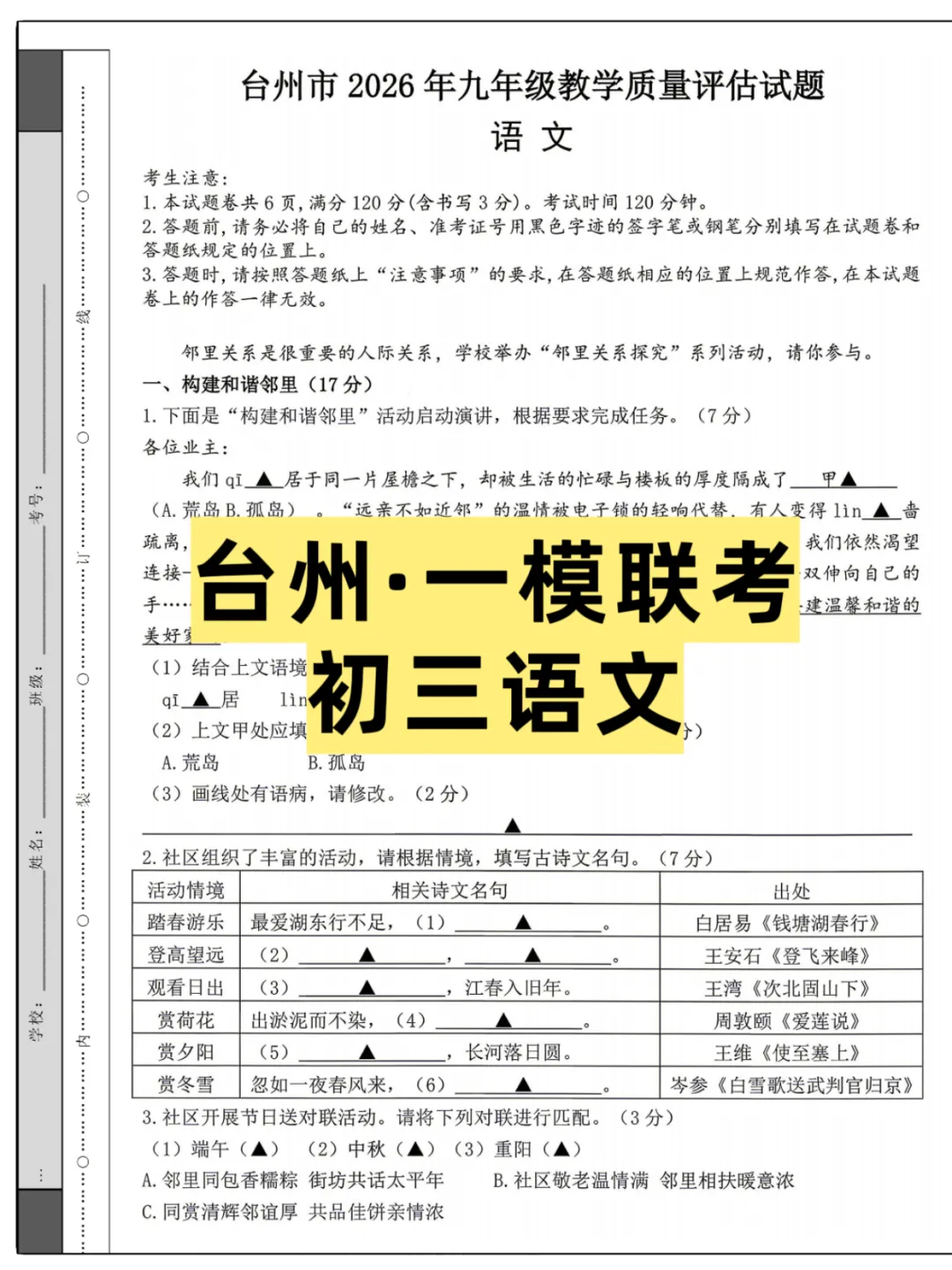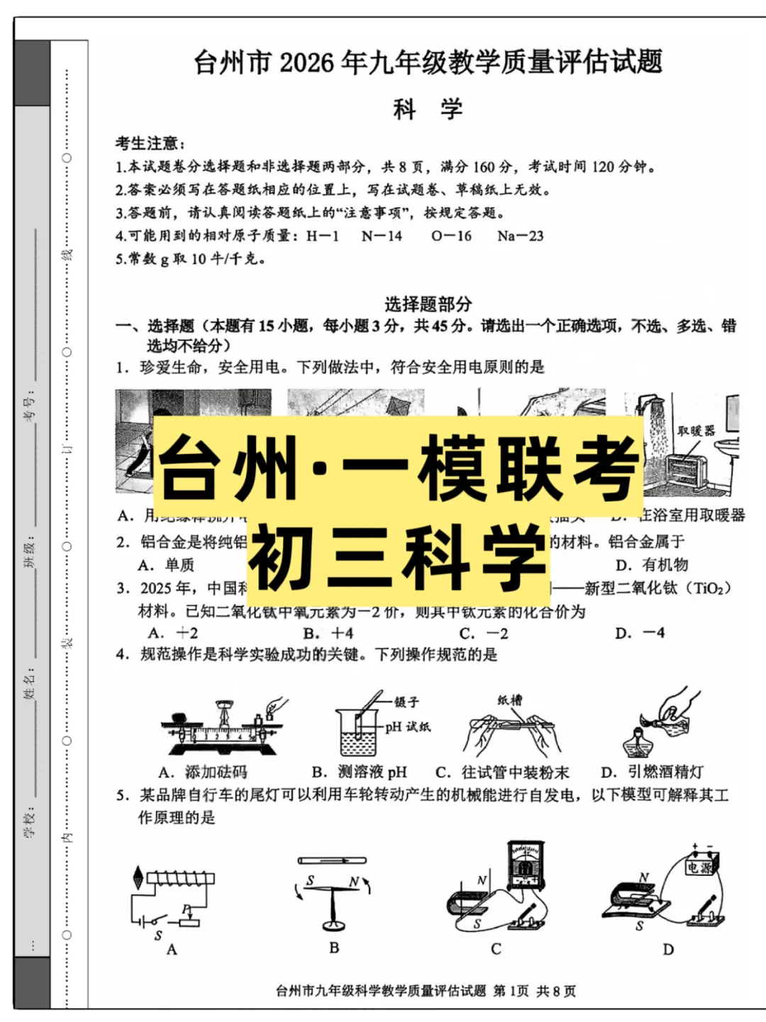 >2026浙江(台州市)初三一模联考,试卷+答案
