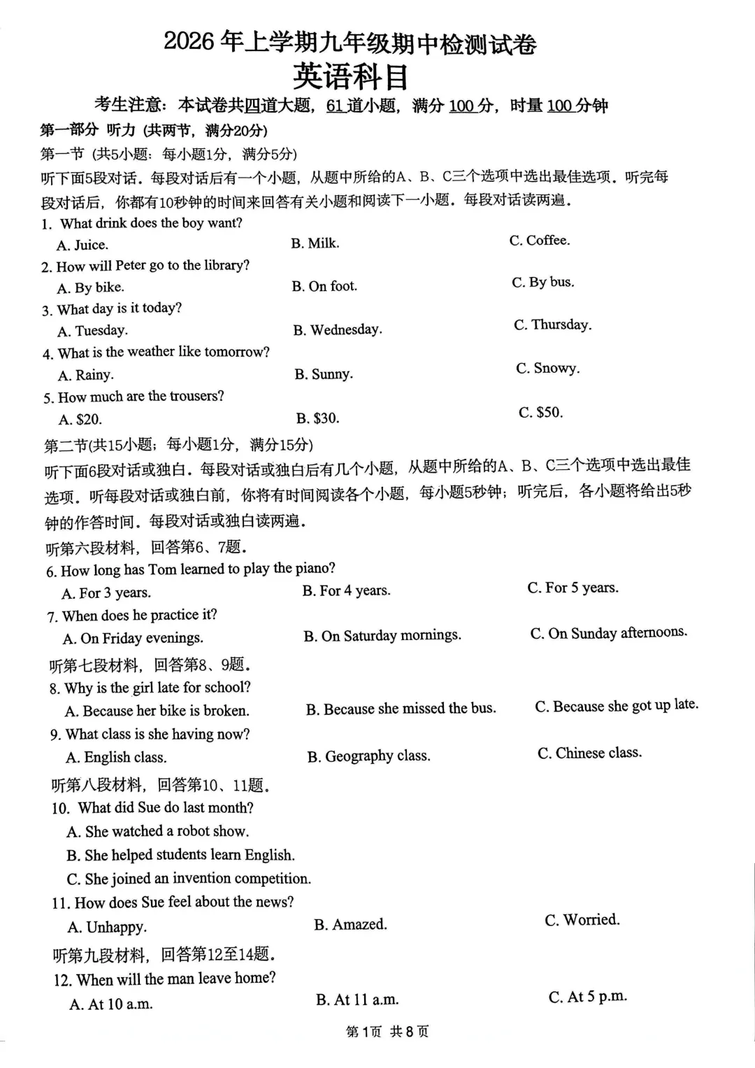 长郡集团都进行了初三年级的期中考试,我们收集到了试卷和答案。公众号回复“上岸”可下载完整电子版。