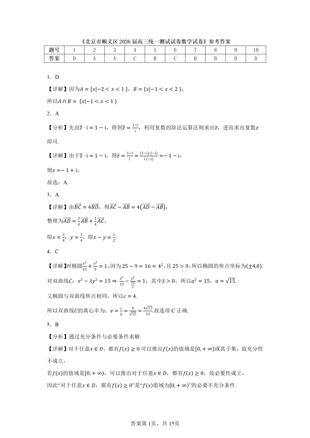 北京市顺义区2026届高三统一测试试卷数学试卷