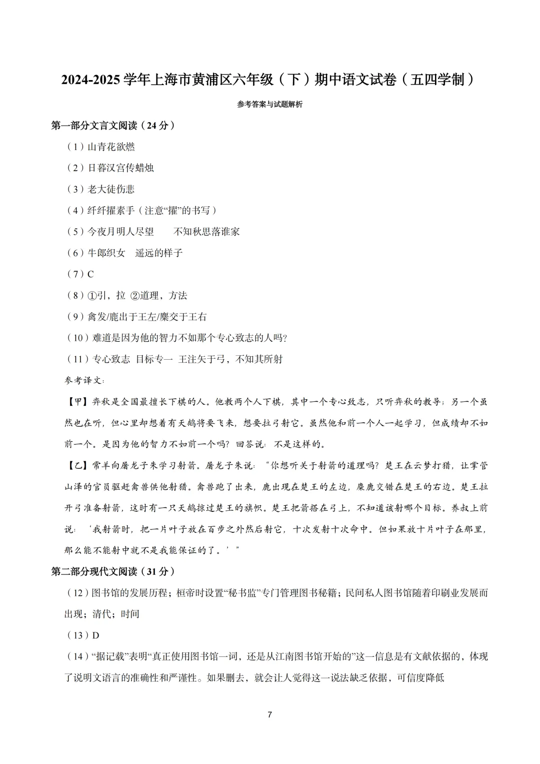 【初中期中试卷】2024-2025学年黄浦区六年级第二学期期中语文试卷