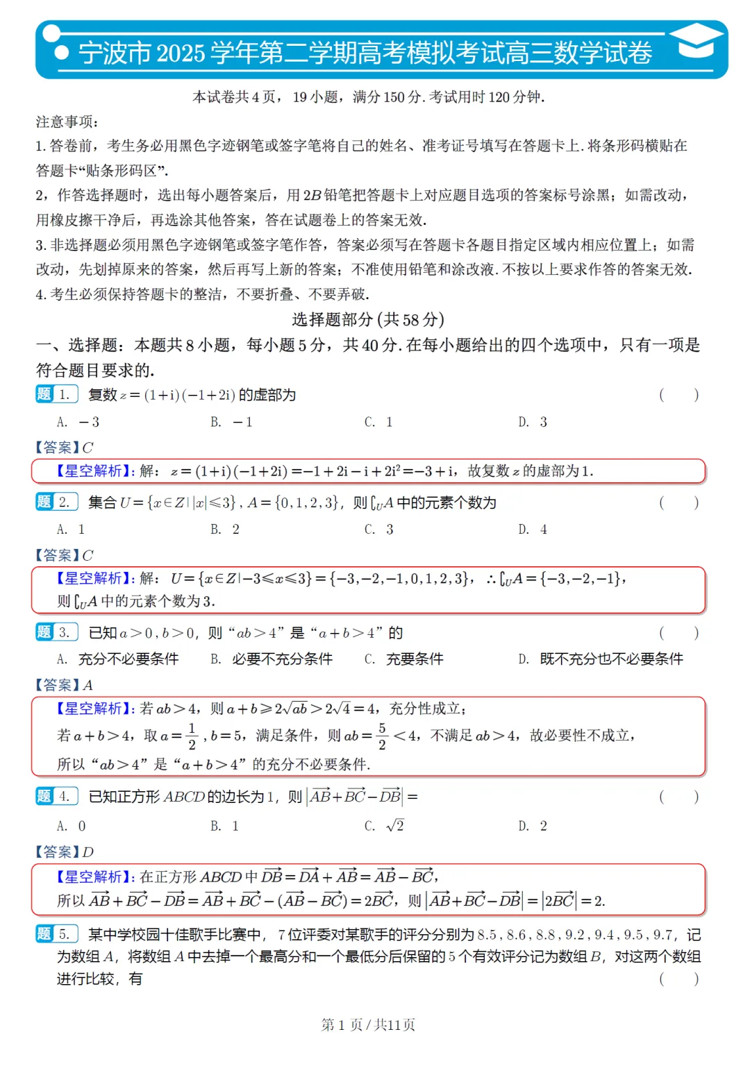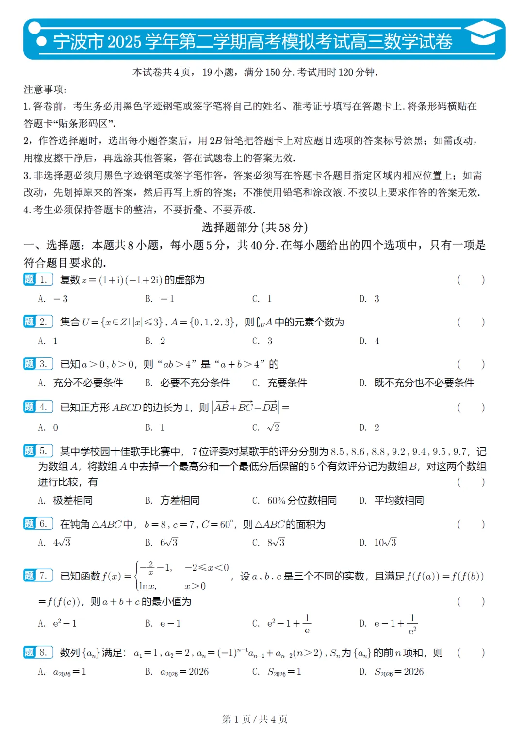 226.浙江宁波十校高三联考数学试卷及逐题解析(2026.3)
