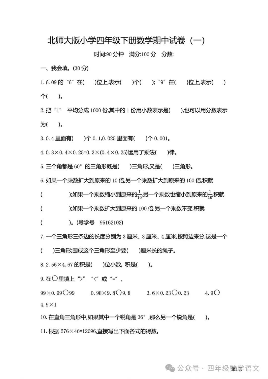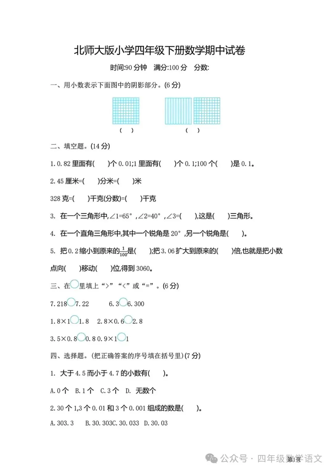 一、1、四 一 2、75 1000 3、锐 直 钝 4、28.5