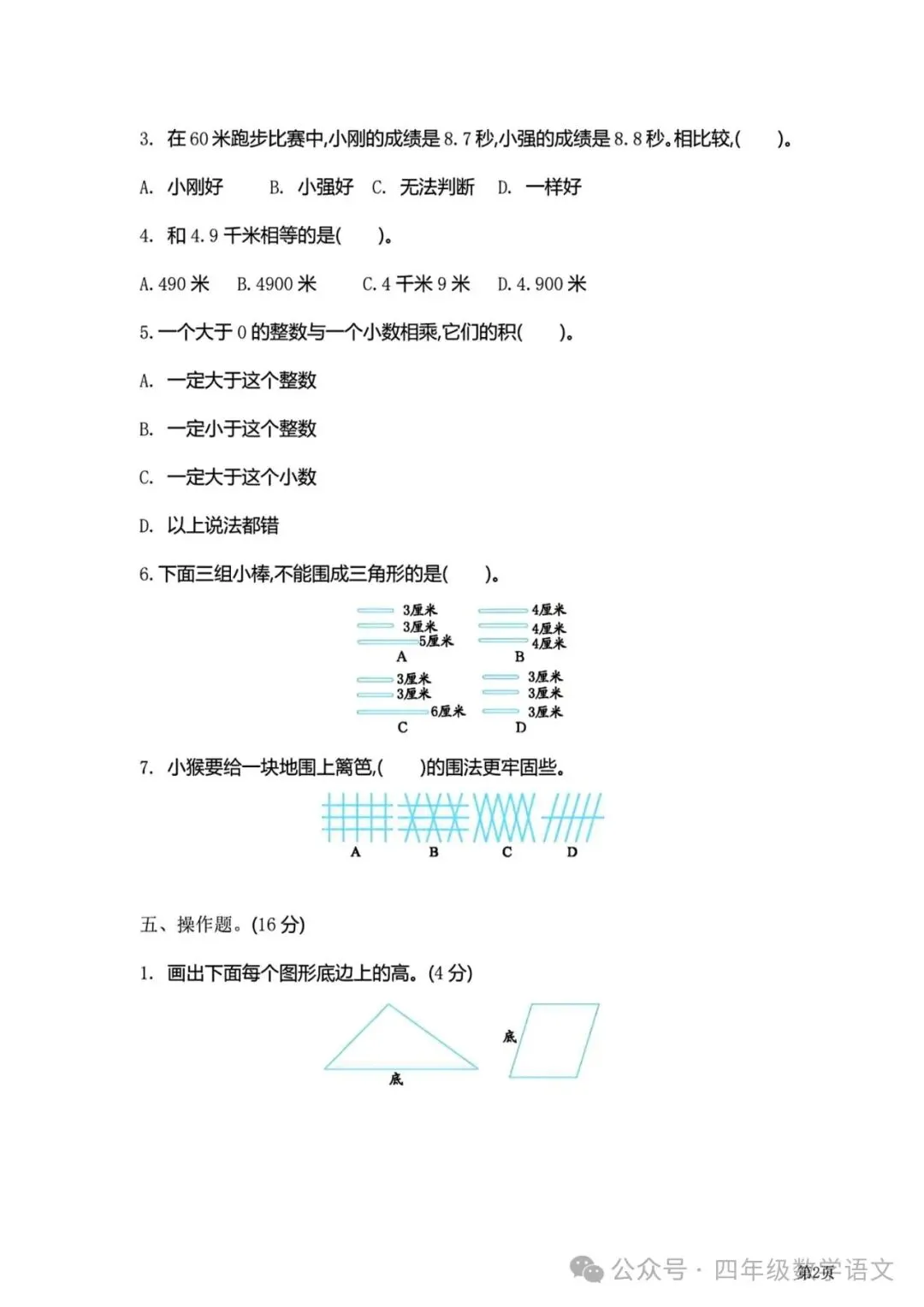 2、一个三角形的两条边分别是40厘米、50厘米,第三条边的长度只能选( )。