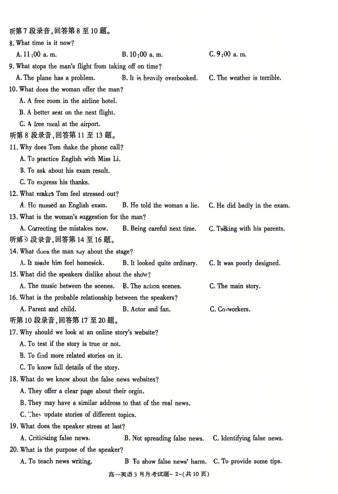 题目设置常规,考查常见场景(航班延误、电话求助、观剧感受、识别假新闻),语速和词汇量适中。