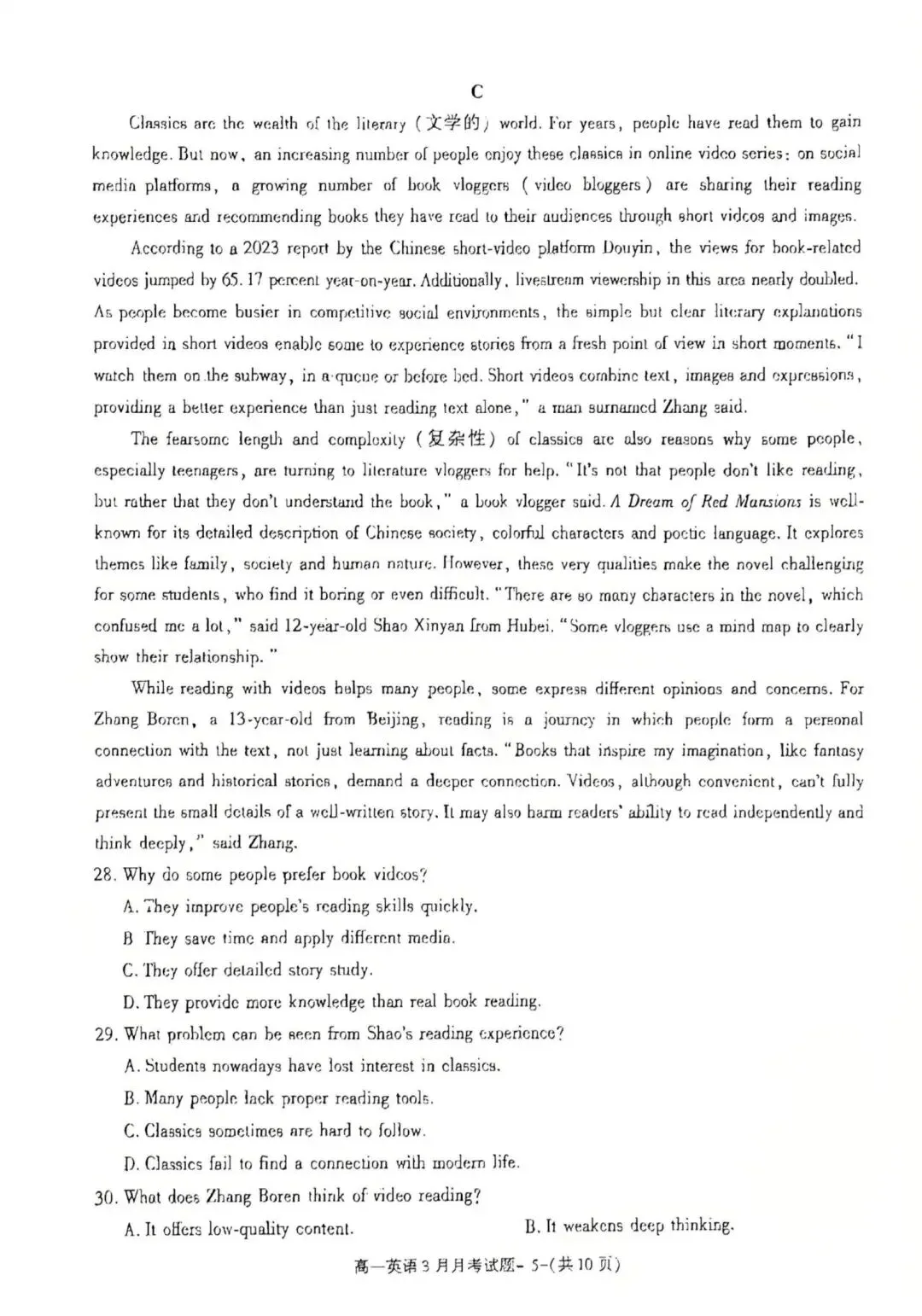 · C篇(视频读书)贴近学生生活,观点对比明确。