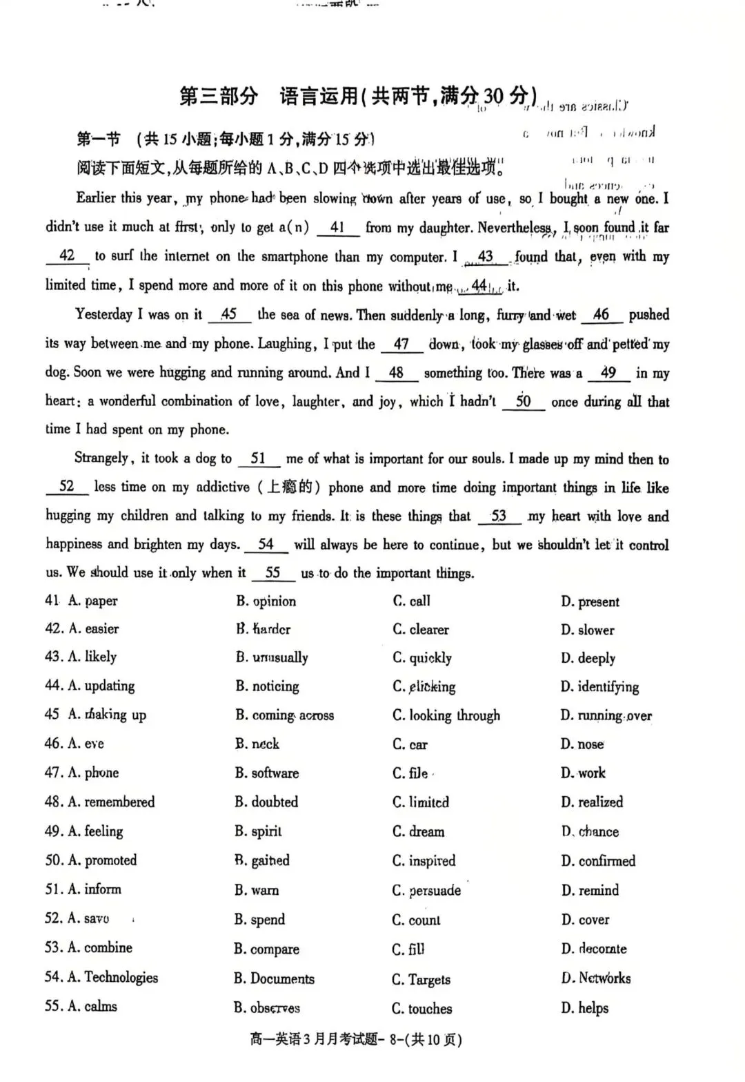 · 完形填空讲述手机成瘾与宠物陪伴,语境真实,选项多为常见搭配。