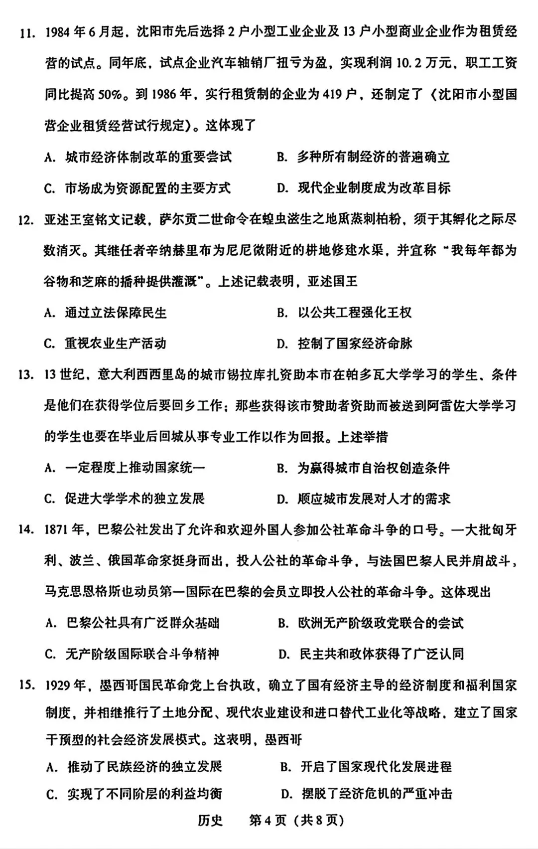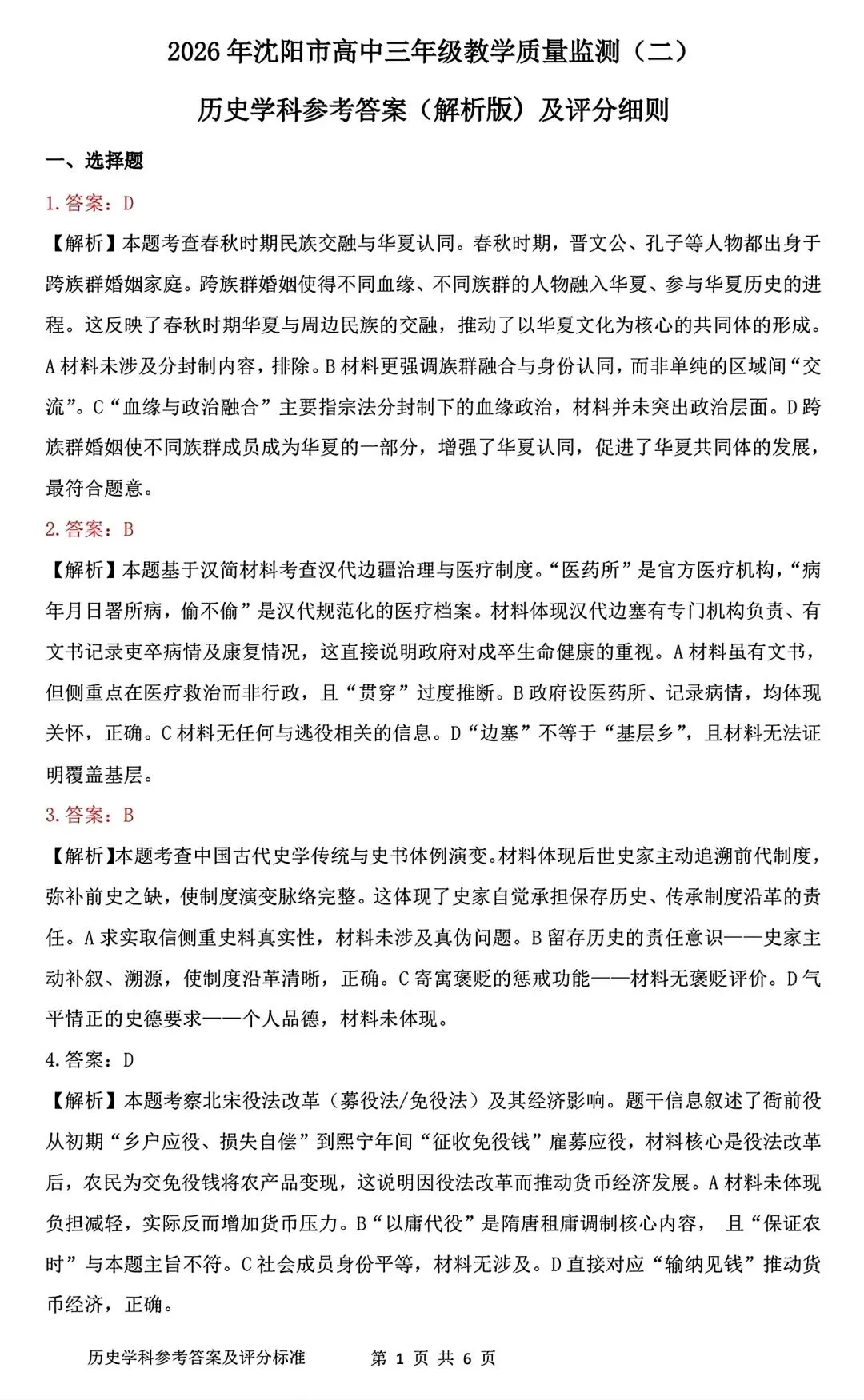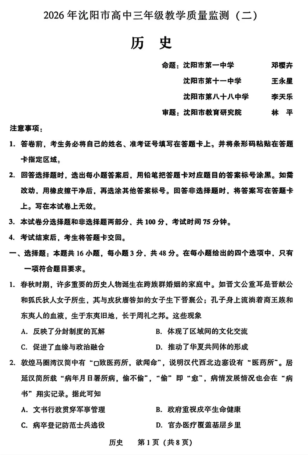 2025-2026辽宁沈阳高三下教学质量监测二模4月历史含答案(无水印).pdf