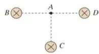 A. 图甲中,三根平行直导线截面图,电流大小相同且到A 点距离相同,则A 点磁感应强度 方向水平向左