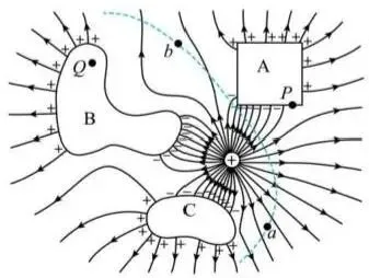 7. 一个正电荷9周围有3种形状各异的金属导电体A 、B 、C 。 在电荷9周围形成如图所示的电 场 分 布 ,P 为导体A 表面上的点,Q 为导体B 内距离9为