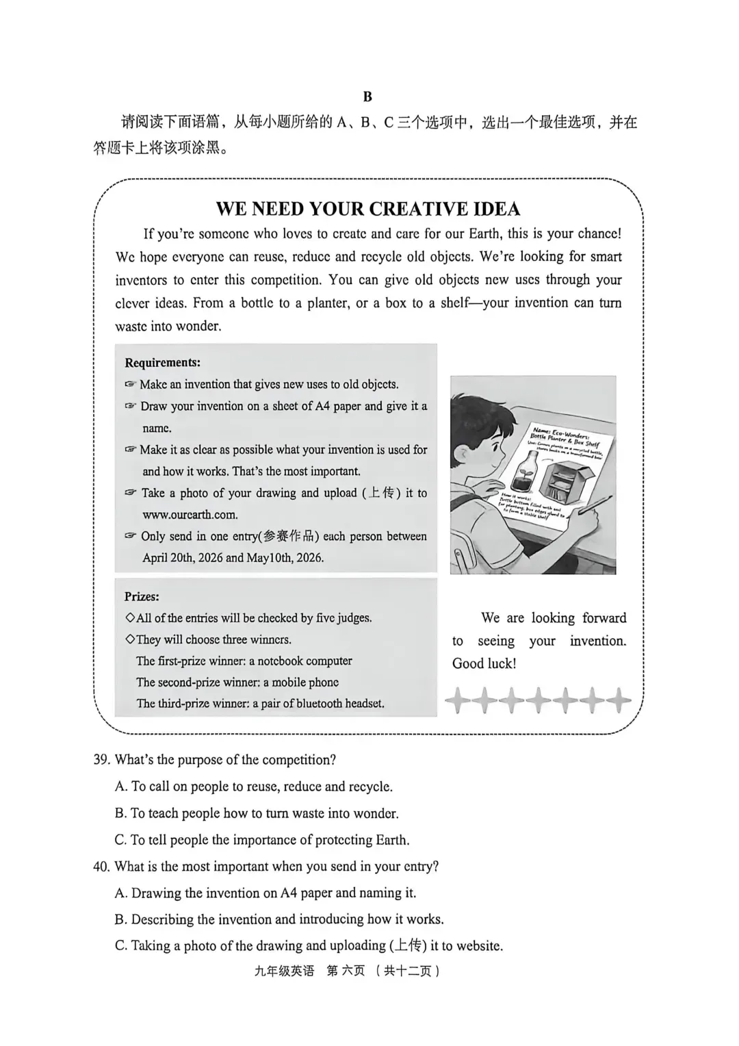 【九英语试卷+听力】2026年孝义市第一次中考模拟考试题(卷)
