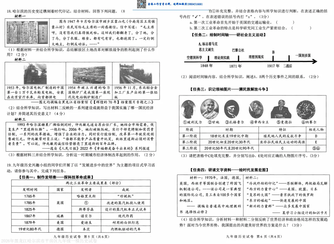 >2026哈尔滨平房区九年级下一模历史 试卷+答案