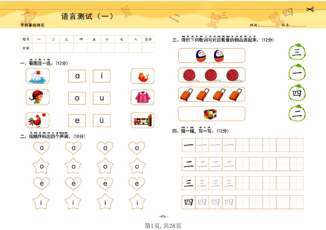 【免费下载】幼小衔接语文 学前测试卷语言1,PDF电子版,共28页,先保存,以免资源失效