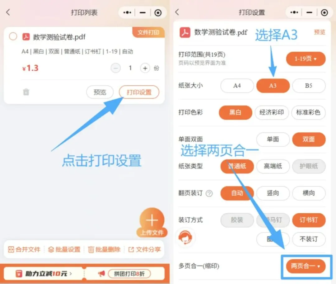 文件上传以后打开【打印设置】,纸张大小选择【A3】,缩印方式选择【两页合一】。