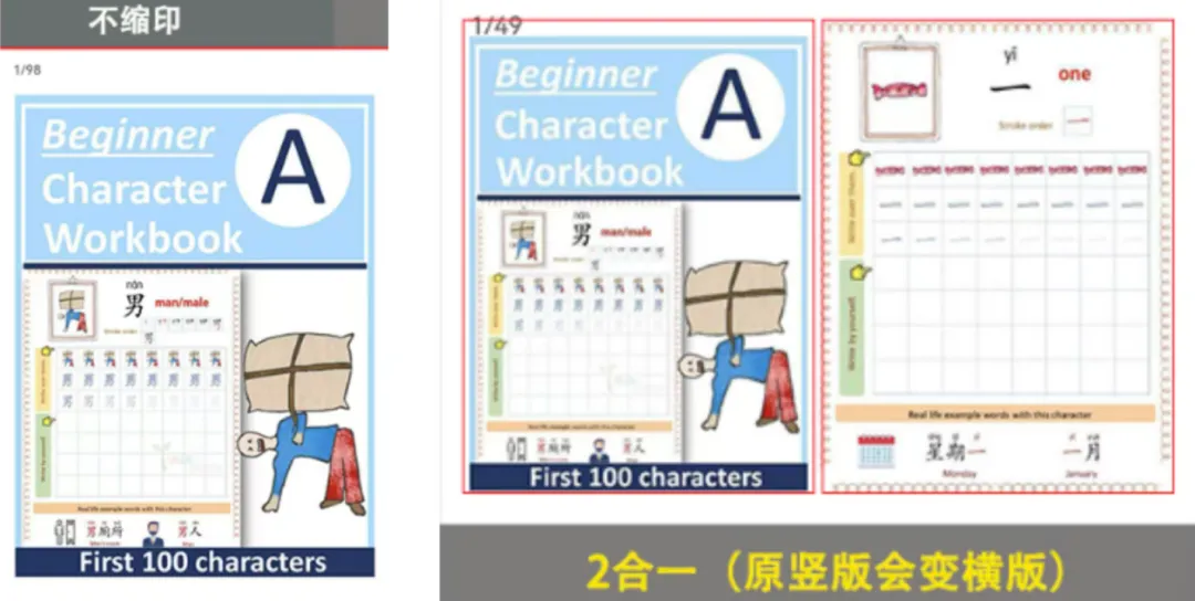 正常A4的竖向文件,当我们设置了“两页合一”以后,竖向的文件就自动变成了横向。
