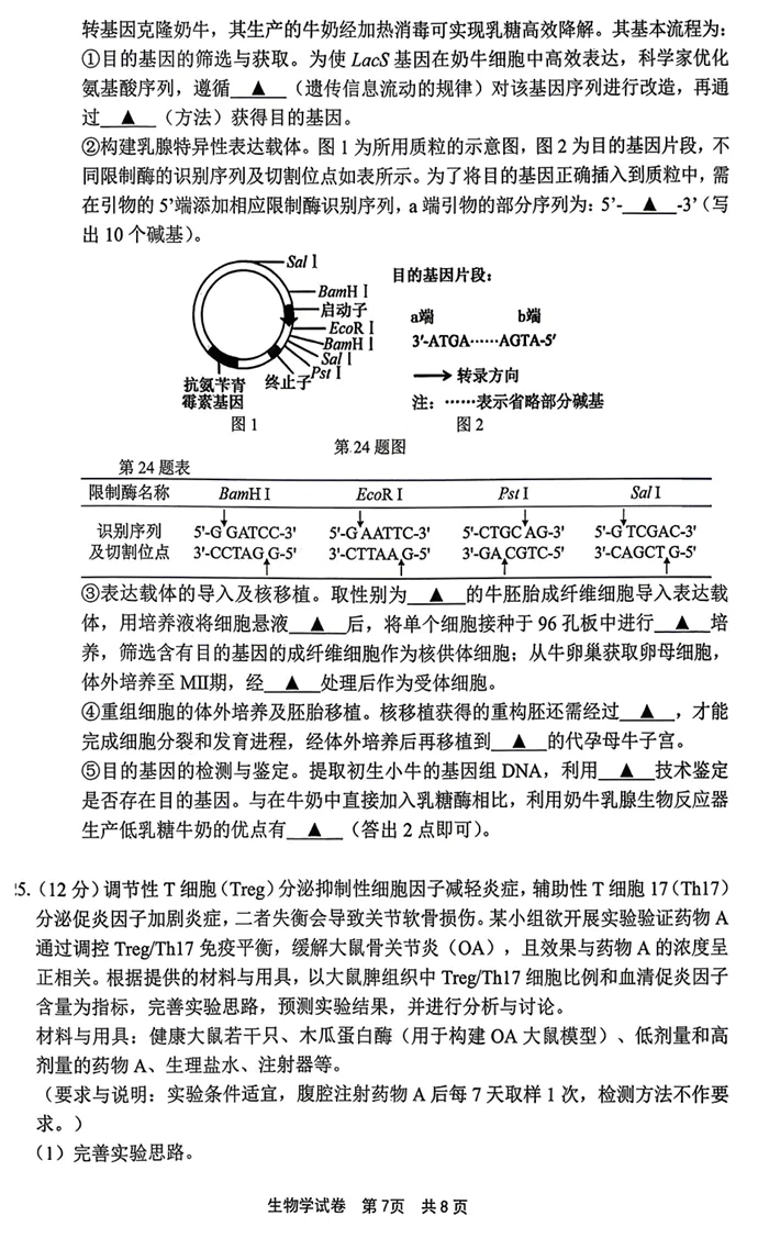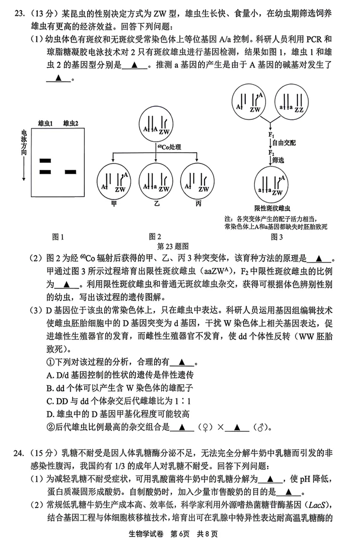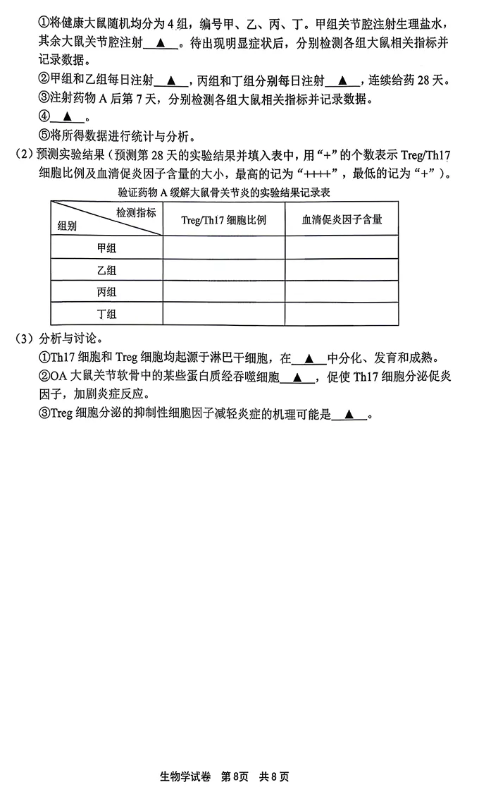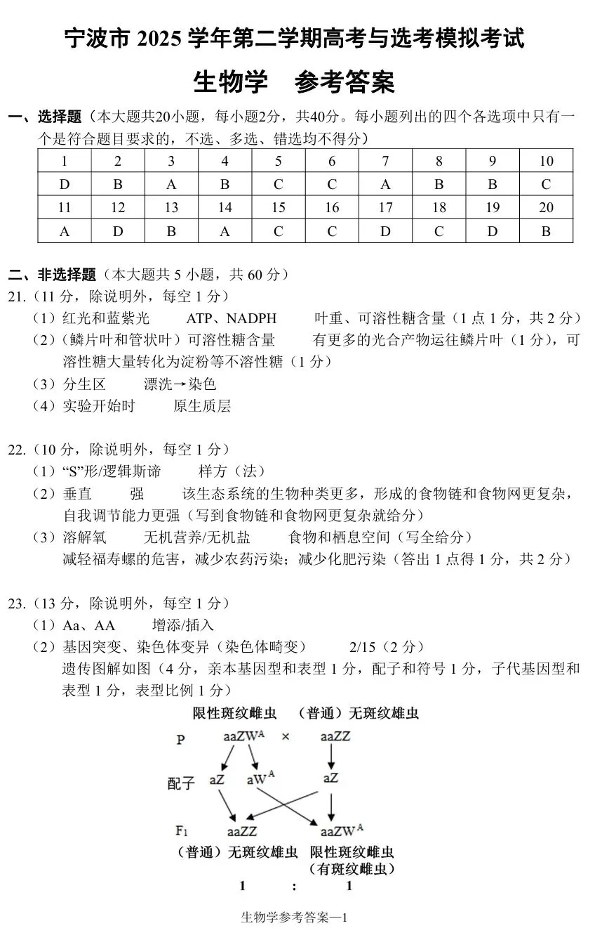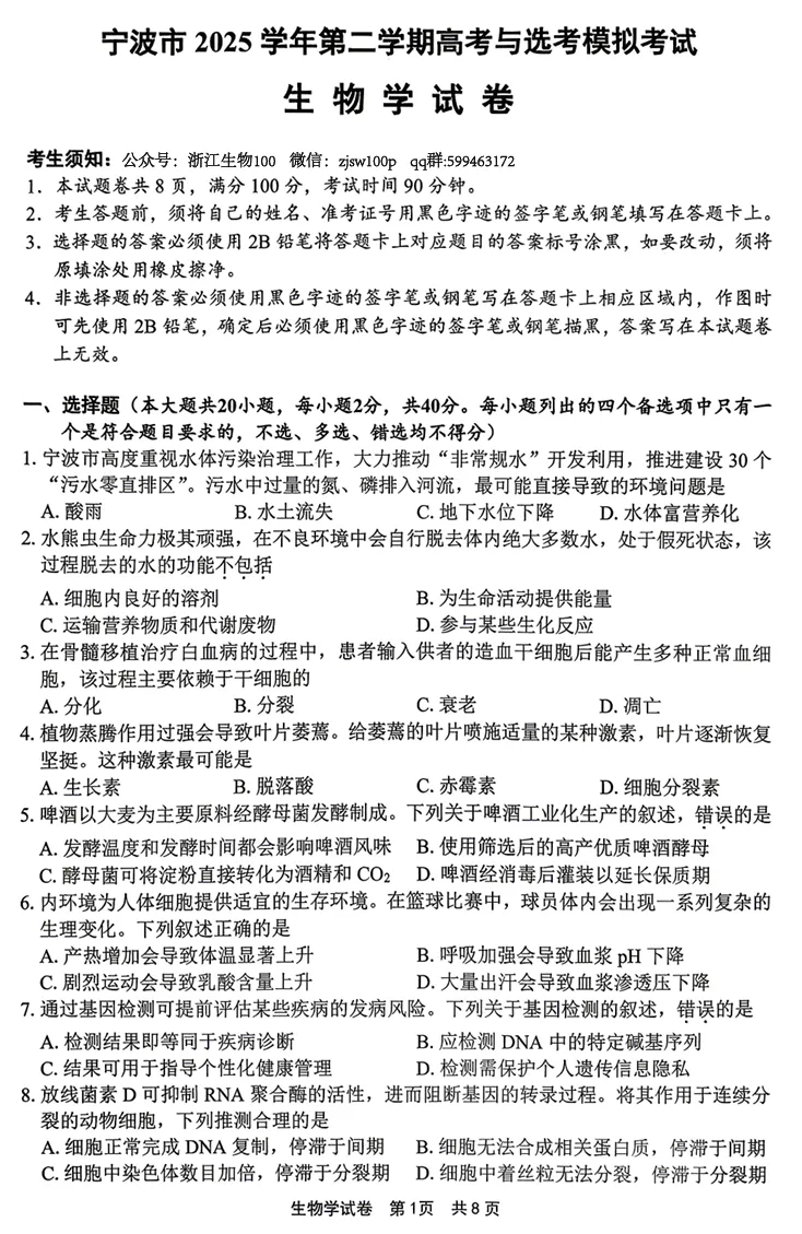 2026年4月嘉兴模拟高三生物试卷、答案和解析(题目新颖!)