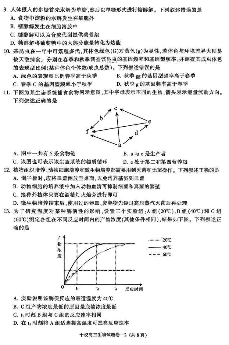 13.D。由于只做了3组实验,无法得知该酶促反应的最适温度,A错;C组产物浓度最低可能是一段时间后酶失活了,B错;C组t1时刻之后产物浓度不变,因此酶可能失活导致反应速率为0,而B组还在继续反应,二者反应速度不同,C错;在t1时刻将A组适当提高温度可提高反应速率,D对。