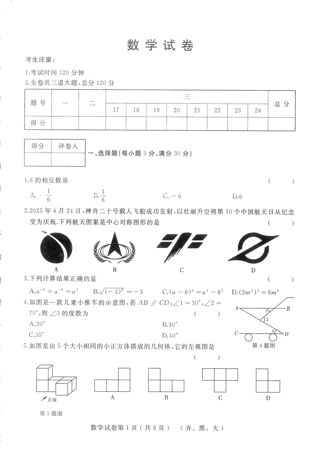 试卷分享 → 2025年武汉中考数学真题
