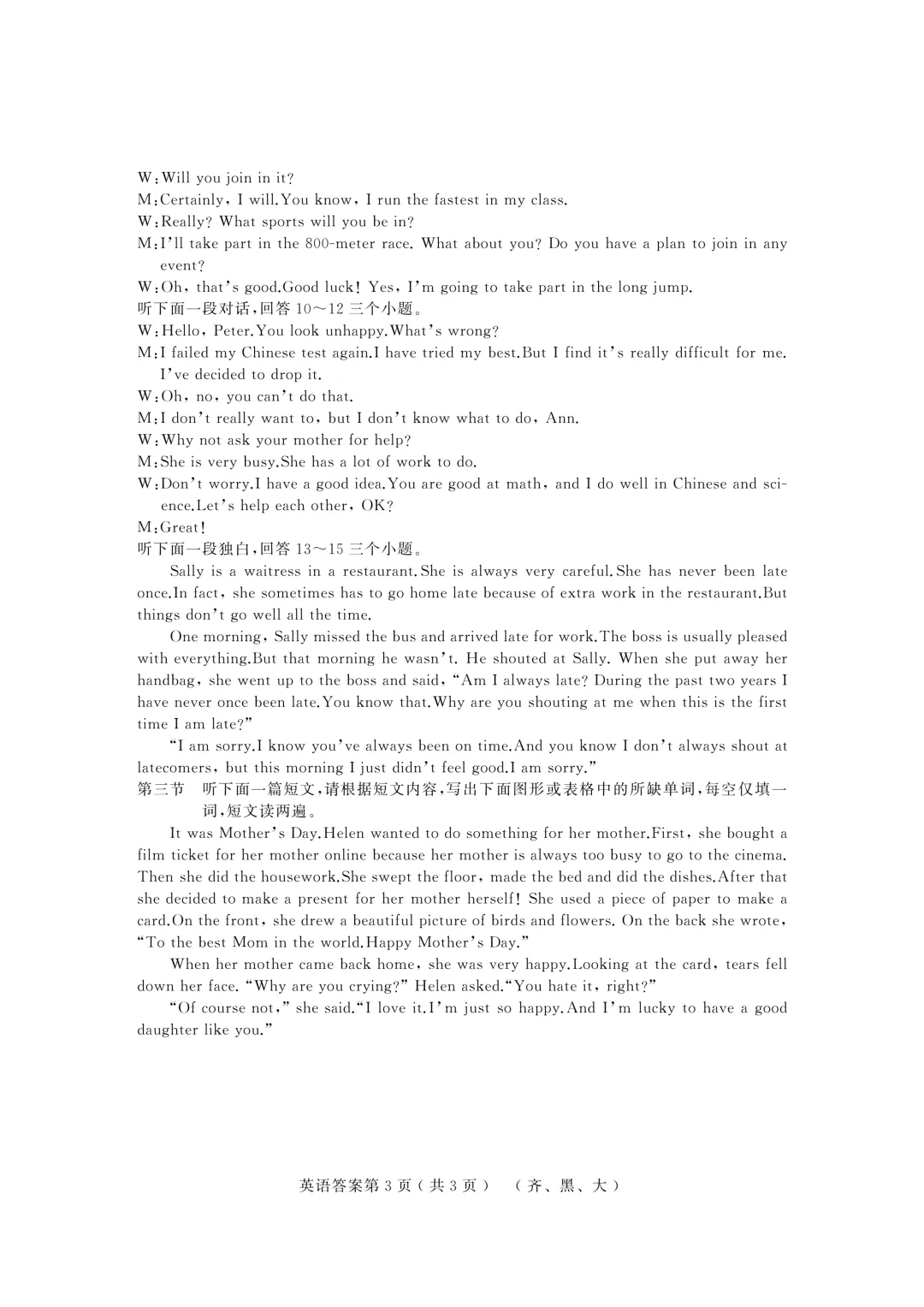 三年级下册第三单元英语试卷