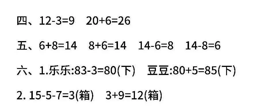 七、8+5=13,12-3=9,15-3-4=8,40+5=45,5+40=45,45-40=5,45-5=40,