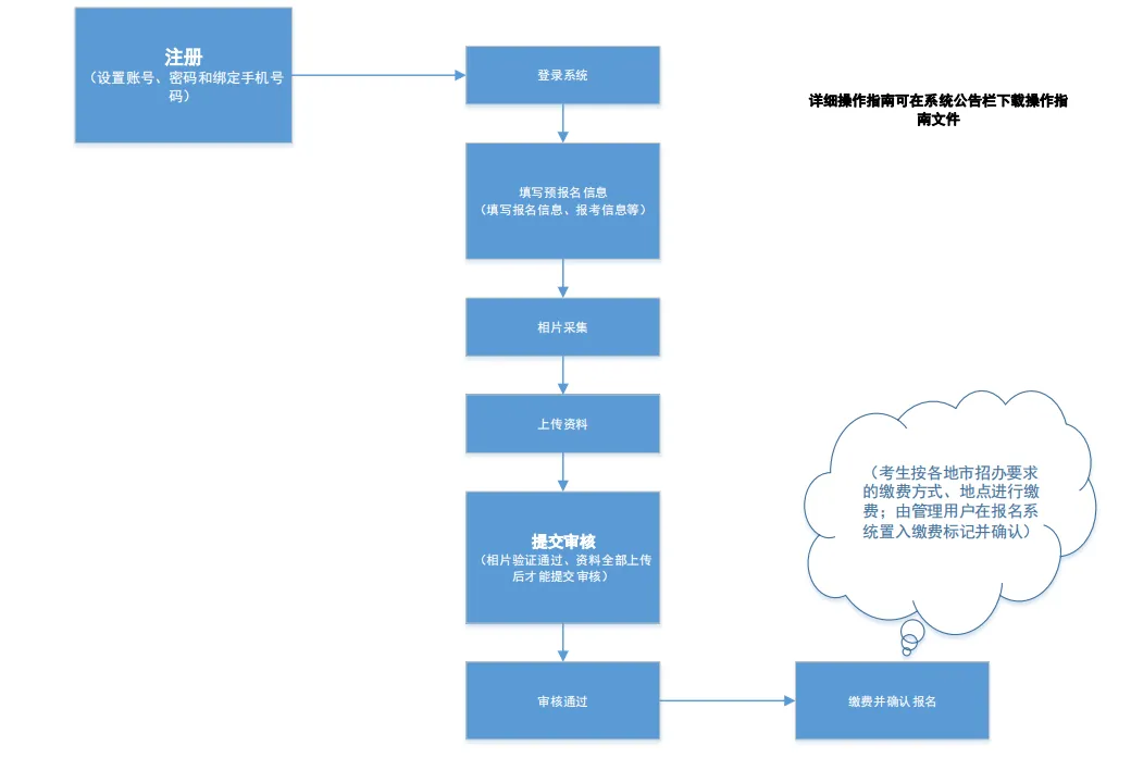 考生在规定时间内登录网上报名系统(https://www.eeagd.edu.cn/zzjnzsks),进行个人信息填写、报考信息填写、上传(户口本、学生证等)资料、进行相片采集,信息确认等报名程序。各地市招生办(报考点)对报考考生进行网上资格审核。报考考生需密切关注审核结果,审核通过的考生需按照各地市招生办确定的方式和时间缴纳考试费;审核不通过考生的报名申请将被退回,无法进行缴费。考生可在规定报考时间截止前重新选择本人符合条件的考点、课程进行报考。