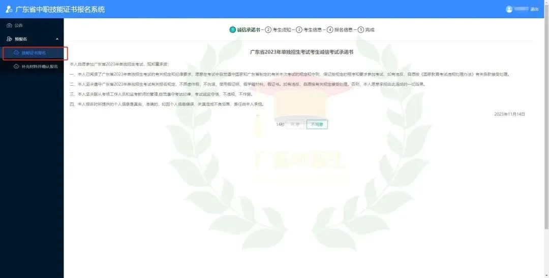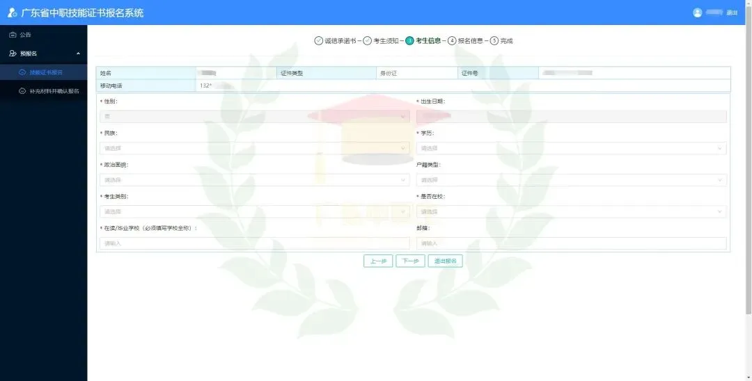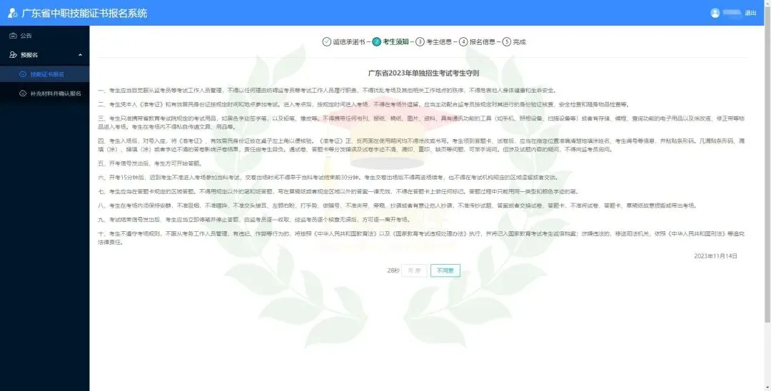 2.考生须认真核对《考生报名信息表》,确保各项信息真实准确。如因考生信息错误导致无法正常考试、无法获得有效的合格证书的,后果由考生自行承担。各级招生考试机构要高度重视考生信息数据的采集工作,各有关报名点要认真指导考生完成报考信息(姓名、身份证号码、相片等)的填报、校对工作。考生报考信息填写完成后,系统会自动生成考生号并在页面上显示,考生还需继续完成上传(户口本、学生证等)资料,进行相片采集,信息确认并提交审核。