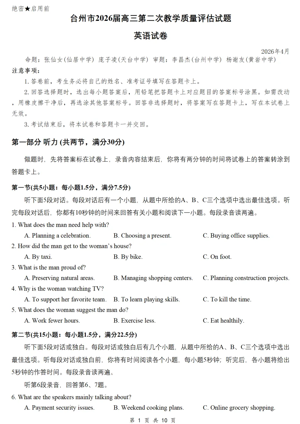 2026届浙江台州二模英语试卷及答案