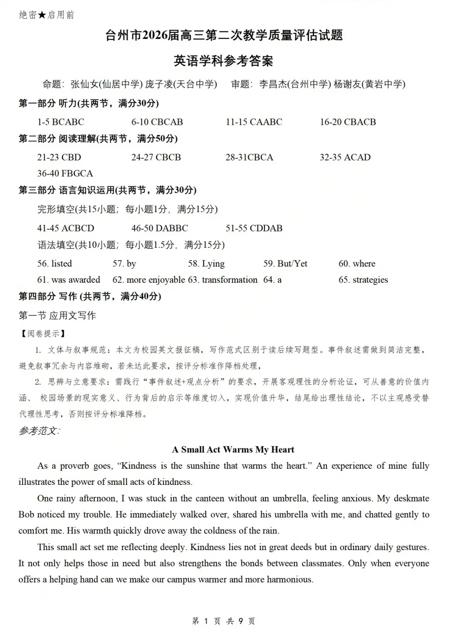 >2026届浙江台州二模英语试卷及答案
