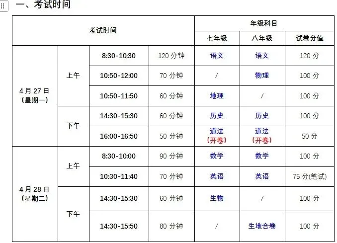 初一初二考试时间:4月27日(周一)~4月28日(周二)