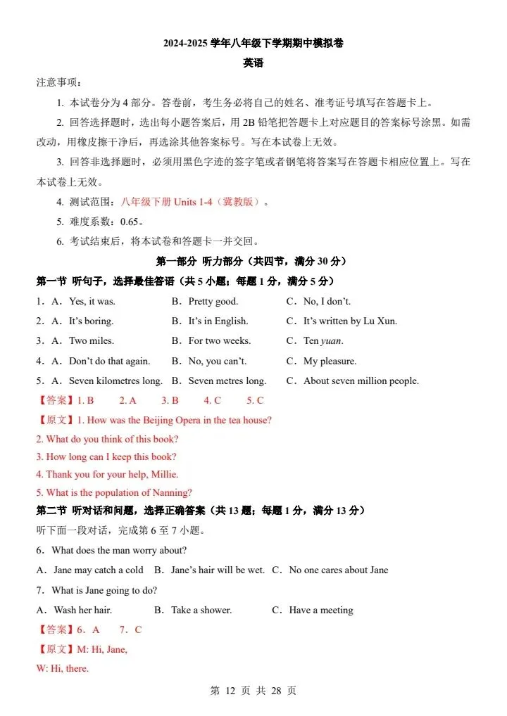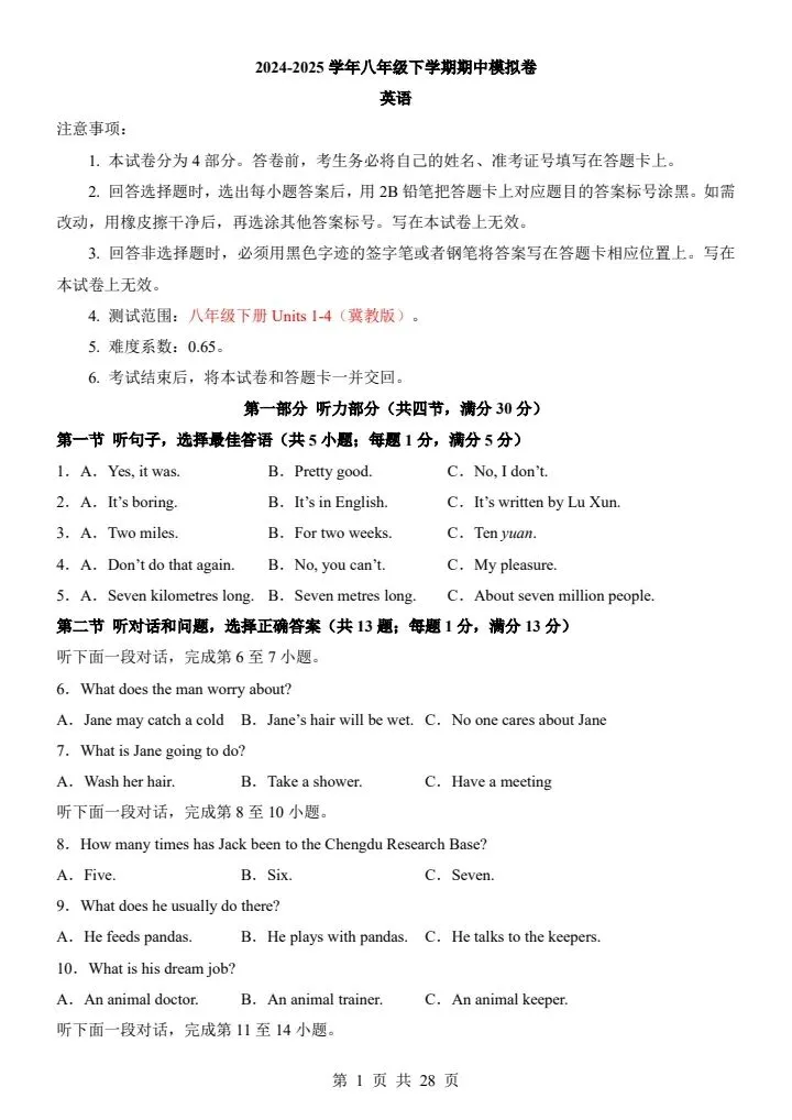 今日分享【冀教版】八年级下册英语期中试卷(答案+答题卡)完整电子版可打印!高清可打印,每日轻量练习,拒绝无效刷题,用系统化资料筑牢学科基础,让假期成为提升的黄金期,开学轻松领跑。
