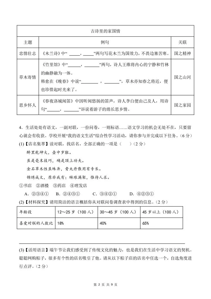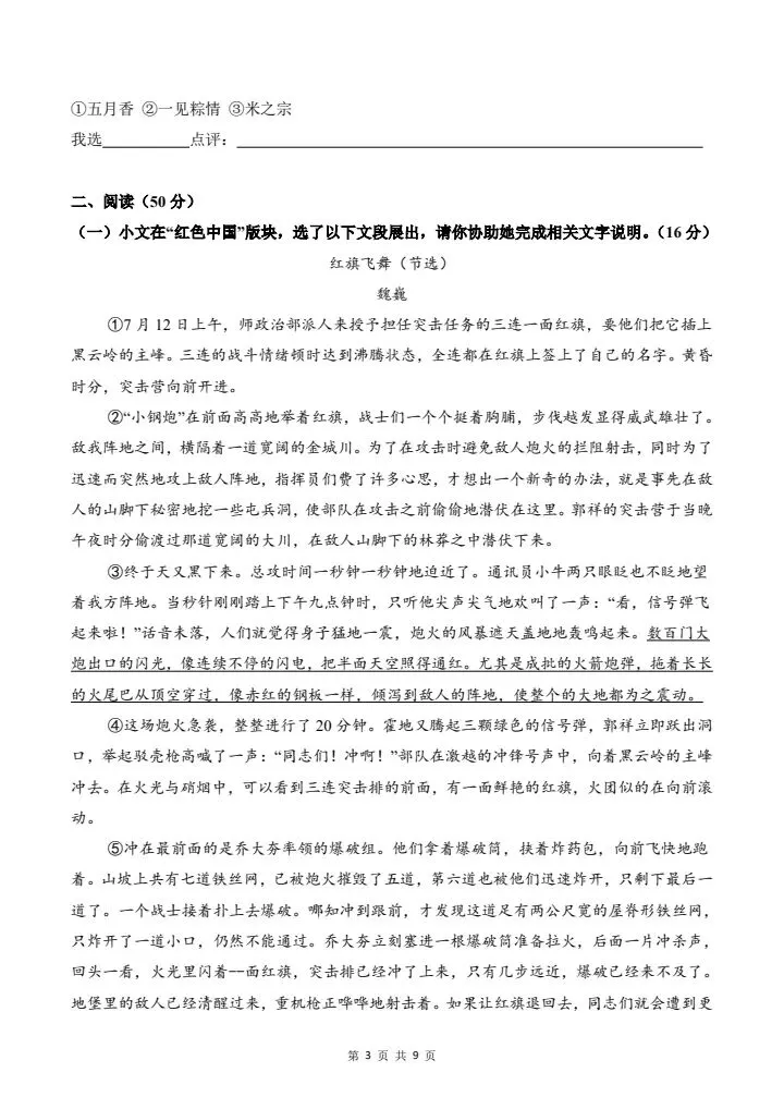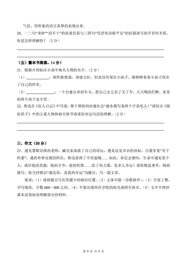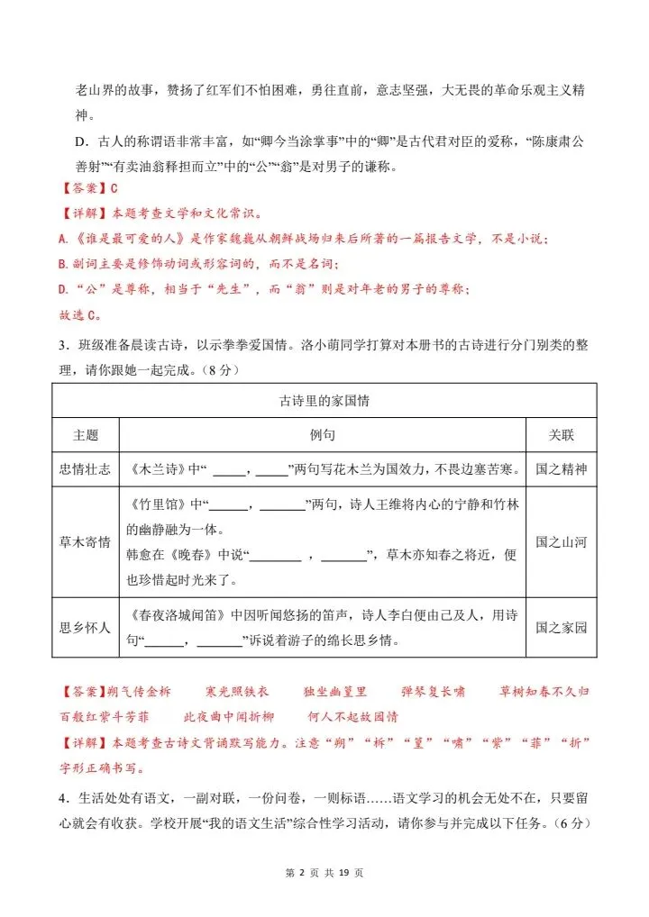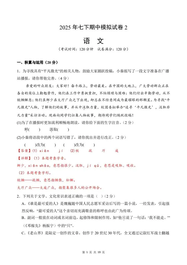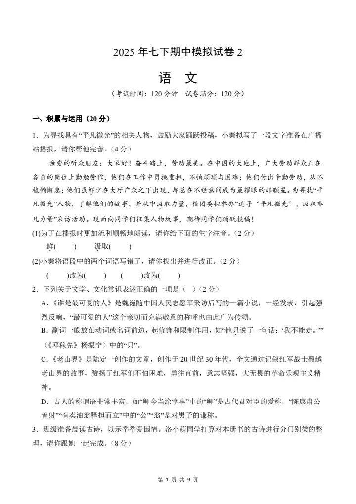 2026年春七年级下册语文《期中模拟试卷》02卷,附详细解析版,完整电子版可打印!