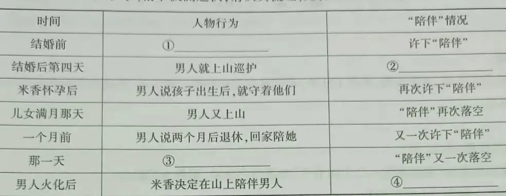 【解析】解答此题,要在整体把握文章内容的基础上,根据表格中的已知信息,将空缺处补充完整。由表格已知信息可知,空①和③处应填写的是“男人”的行为,由“没结婚前”和“许下‘陪伴’”可知对应的行为在文章第②自然段,可提取关键信息:“男人就许诺,把米香娶回家,他就守着家,不再守山洞了”,据此可概括为“男人”许诺把米香娶回家,就守着家;由“一天”和“‘陪伴’又一次落空”及上下空里面的已知信息可知,空③处所在答题区域为文章第⑨自然段,可概括为“男人”为救熊仔,从树上摔下来,昏迷过去,没能抢救过来。空②和空④处应填写“陪伴”情况,根据前面对应的“人物行为”及上下空里的内容,可分别填为 “陪伴”落空 和实现“陪伴”。