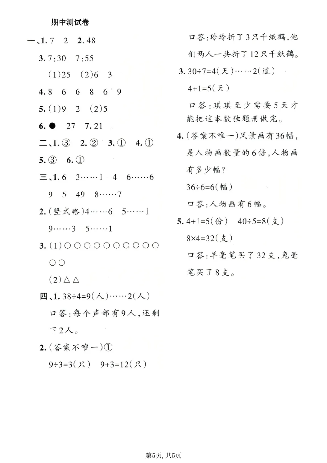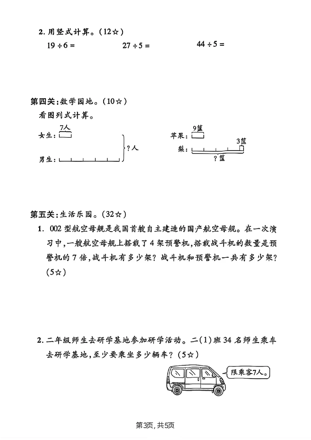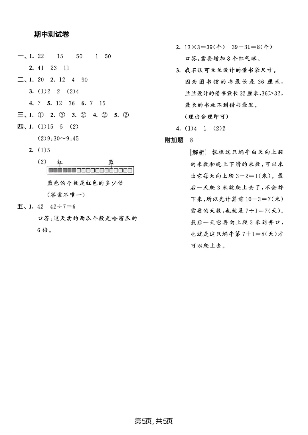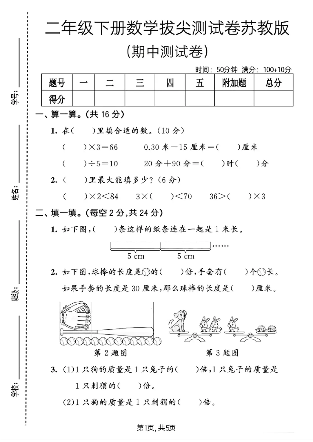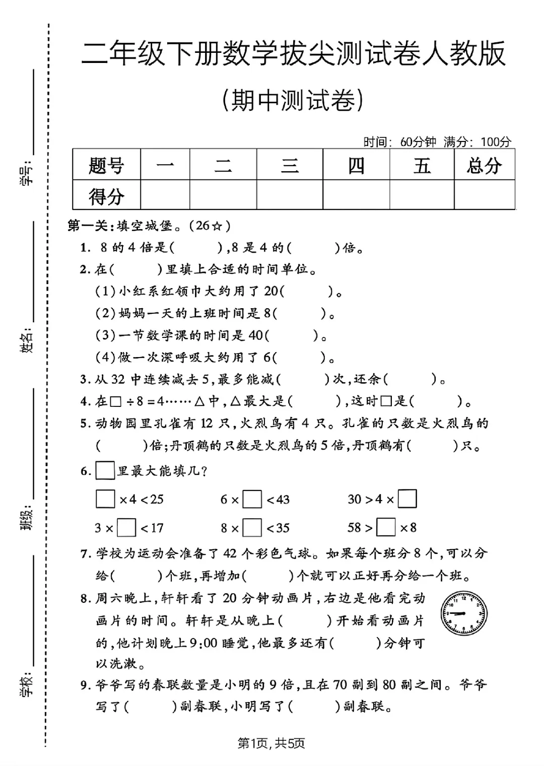2026年二年级下册数学、语文期中试卷(共5套)(电子版可打印)