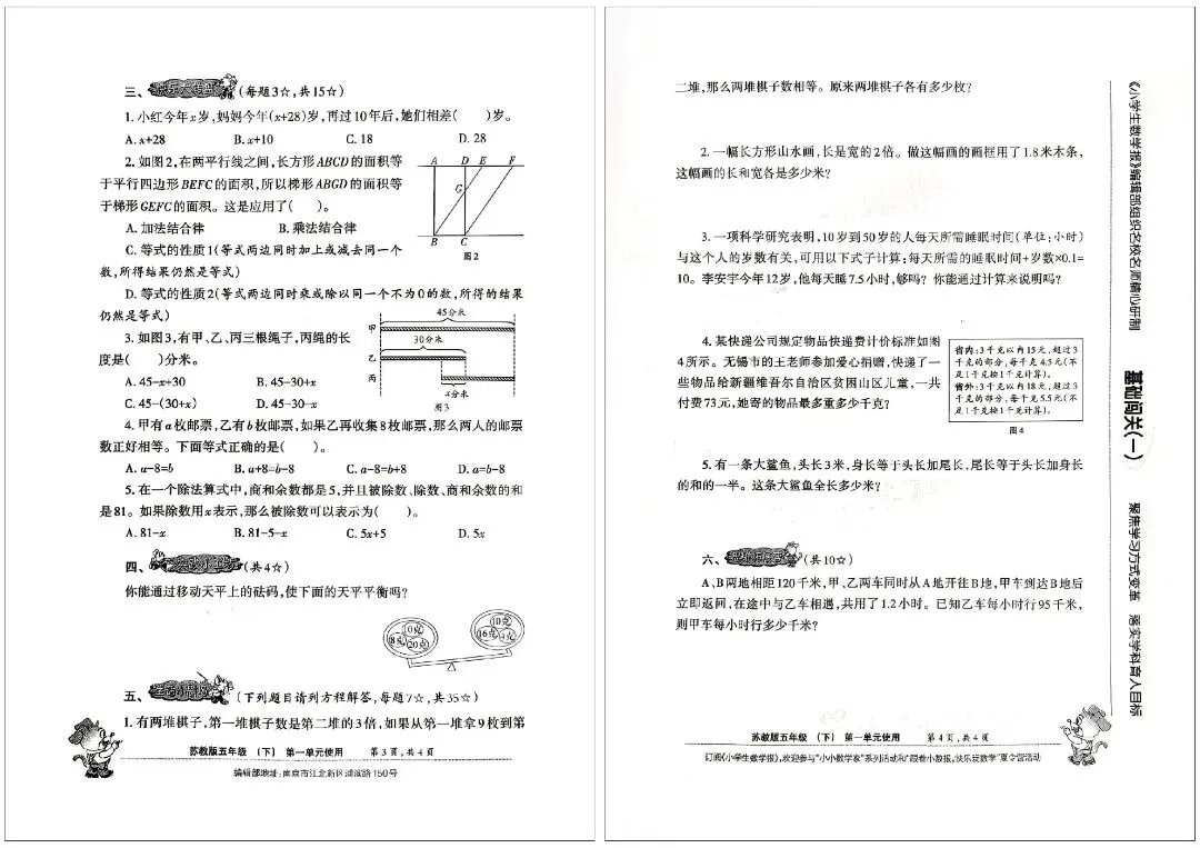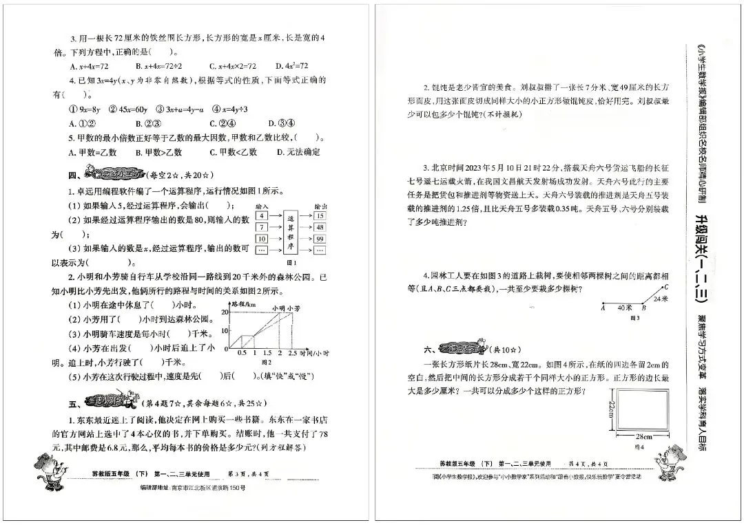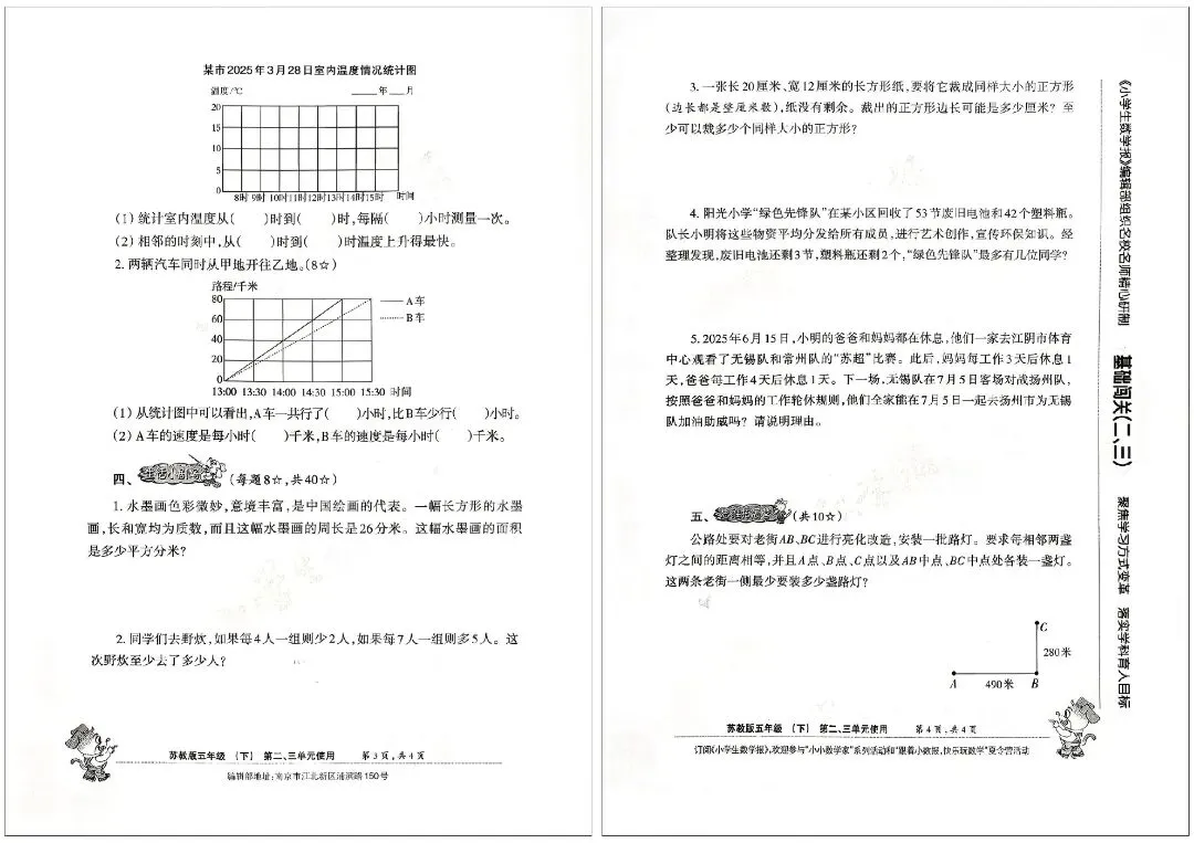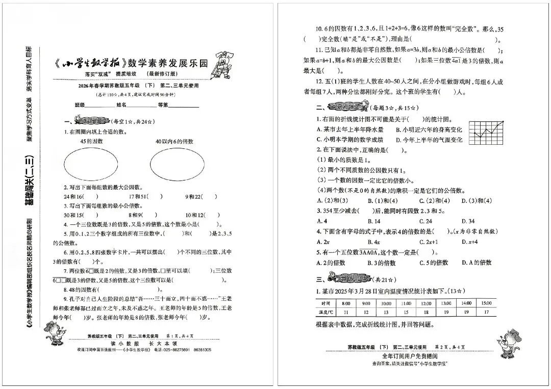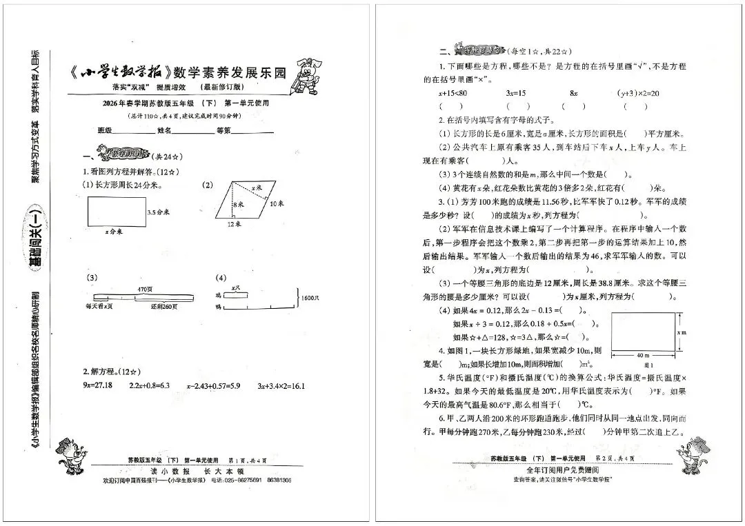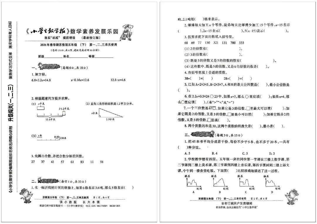 2026 春苏教版五年级下册小学生数学报试卷,同步五下简易方程、因数与倍数、长方形和正方形的表面积、分数的意义和性质、分数加法和减法、折线统计图等核心单元内容,深度贴合苏教版教材改版要求,题型新颖且贴合考情。