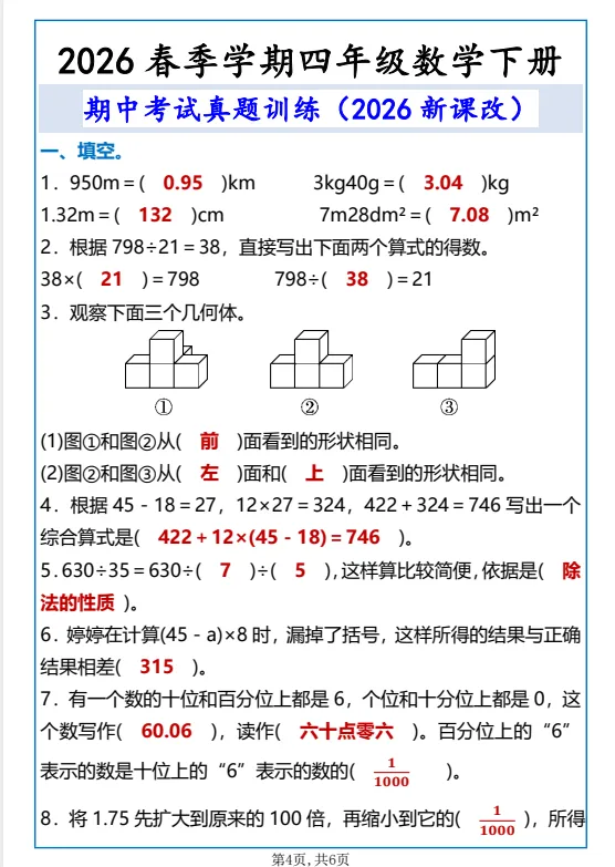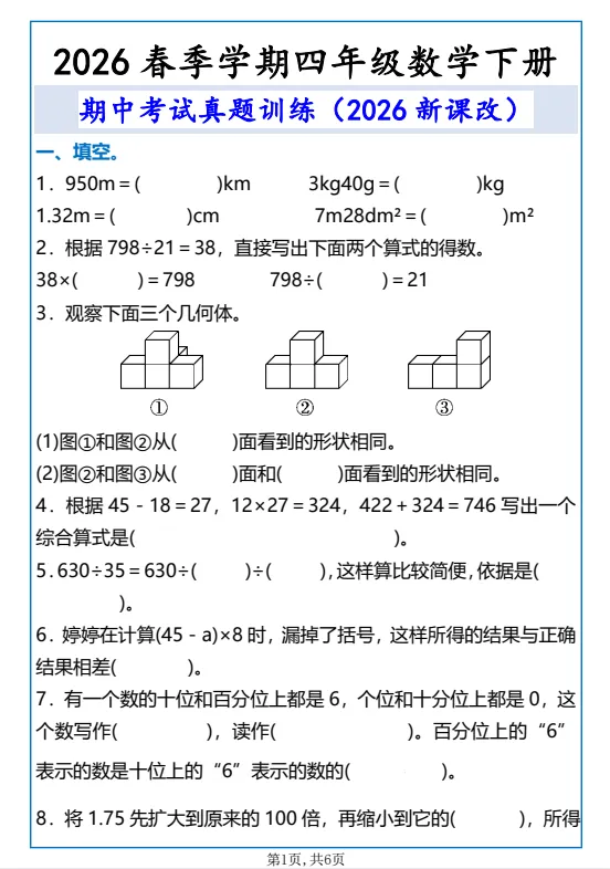 电子版可下载打印,精准适配2026春新版人教版四年级下册数学教材,聚焦期中核心考点,精选多套名校期中真题,涵盖填空题、选择题、计算题、操作题、解决问题等期中常考题型,贴合校内期中命题规律,覆盖四则运算、运算定律、小数的意义和性质、三角形等期中重点模块。题型梯度清晰,兼顾基础巩固与能力提升,搭配详细答案解析,标注考点及易错点,方便孩子自查自纠、查漏补缺,熟悉期中测试节奏,强化解题技巧,从容应对期中检测,稳步提升数学成绩。