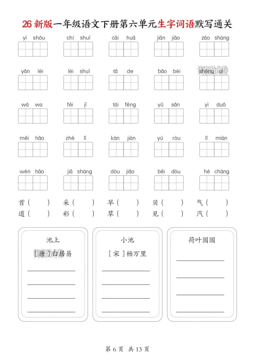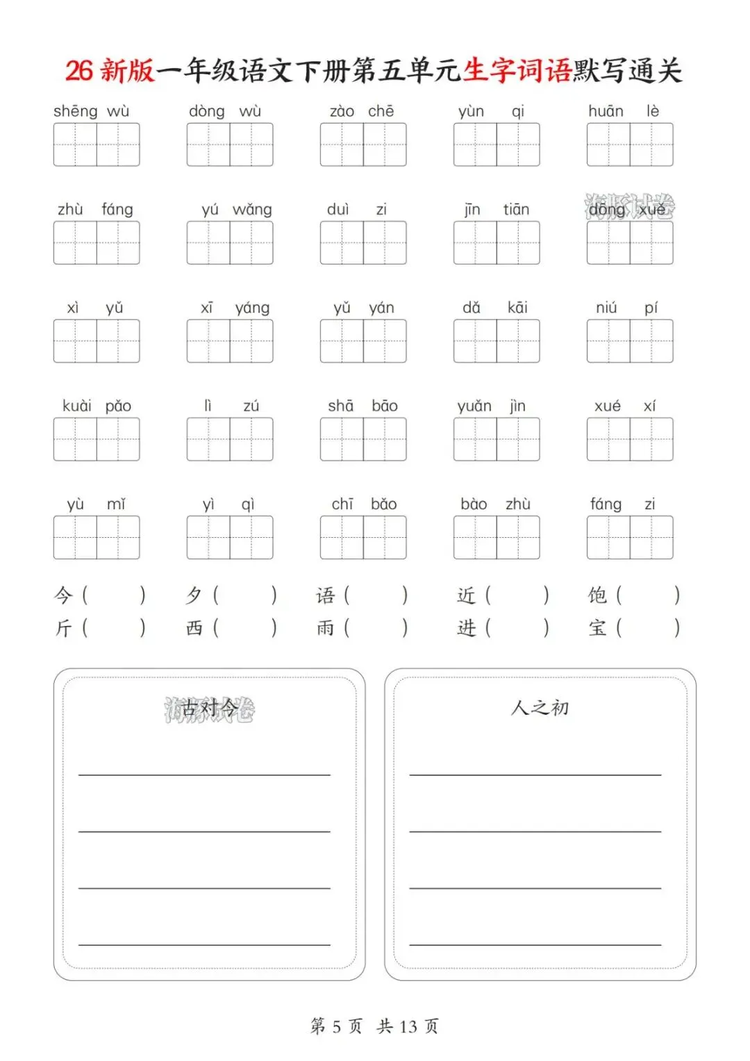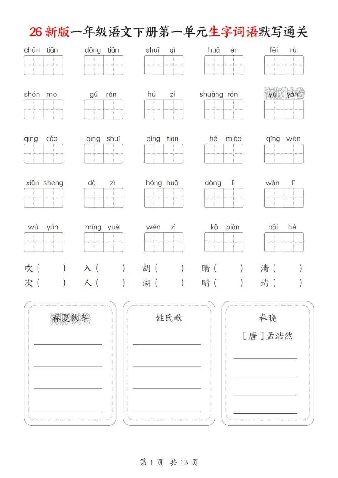 【海豚试卷】一年级(下)语文1-8生字词语默写通关(可收藏打印)